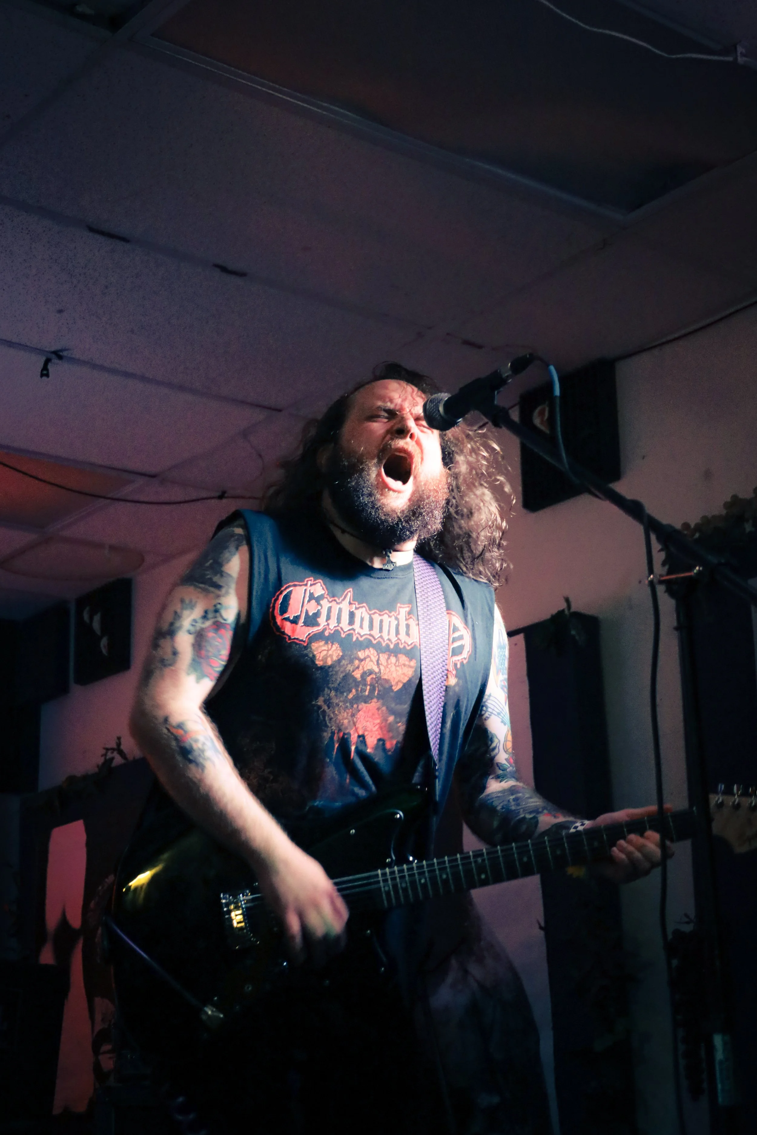 A male guitarist singing passionately into a microphone on stage, wearing a black sleeveless band shirt with tattoos on his arms, dark hair and beard, playing a black electric guitar in a live music venue.