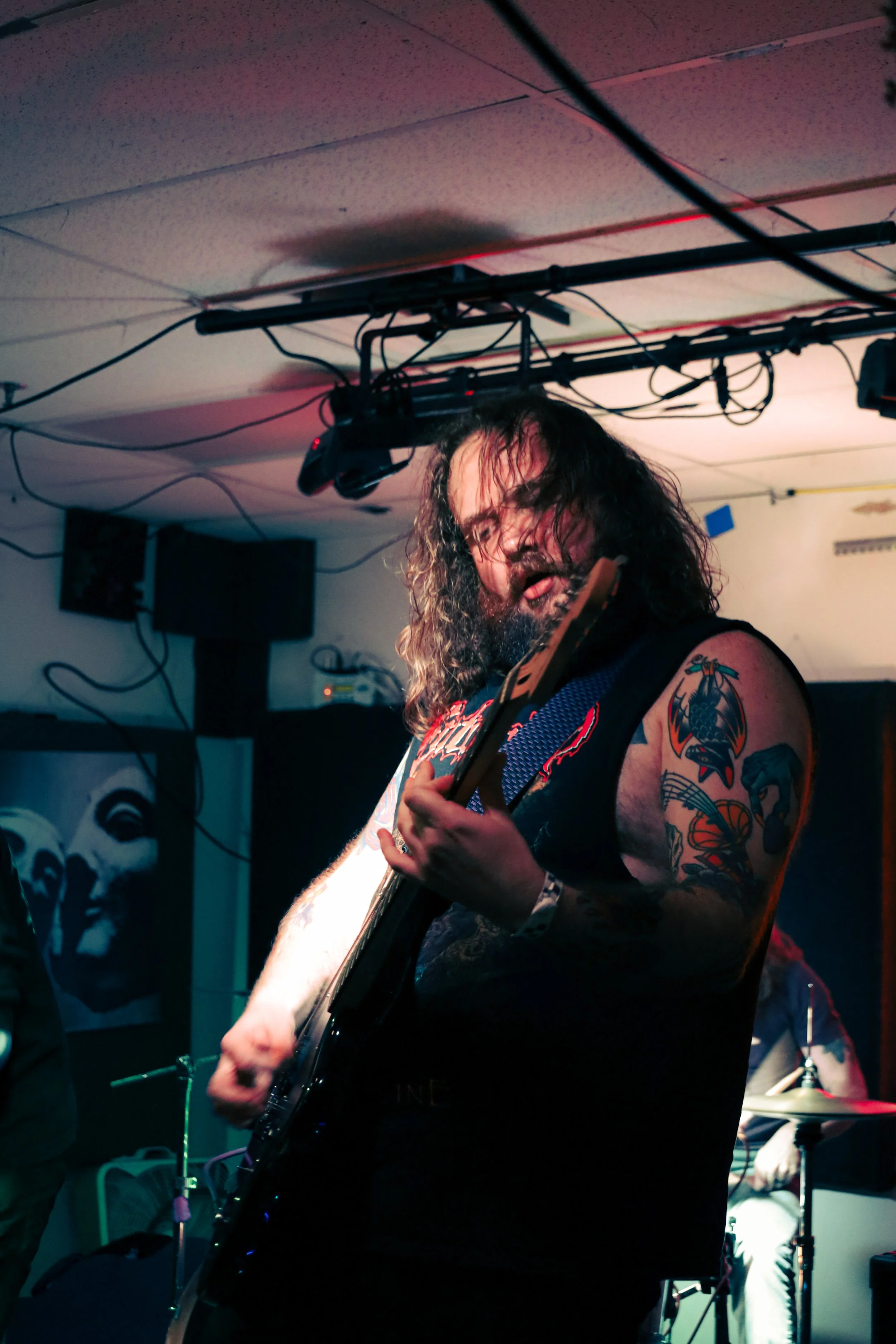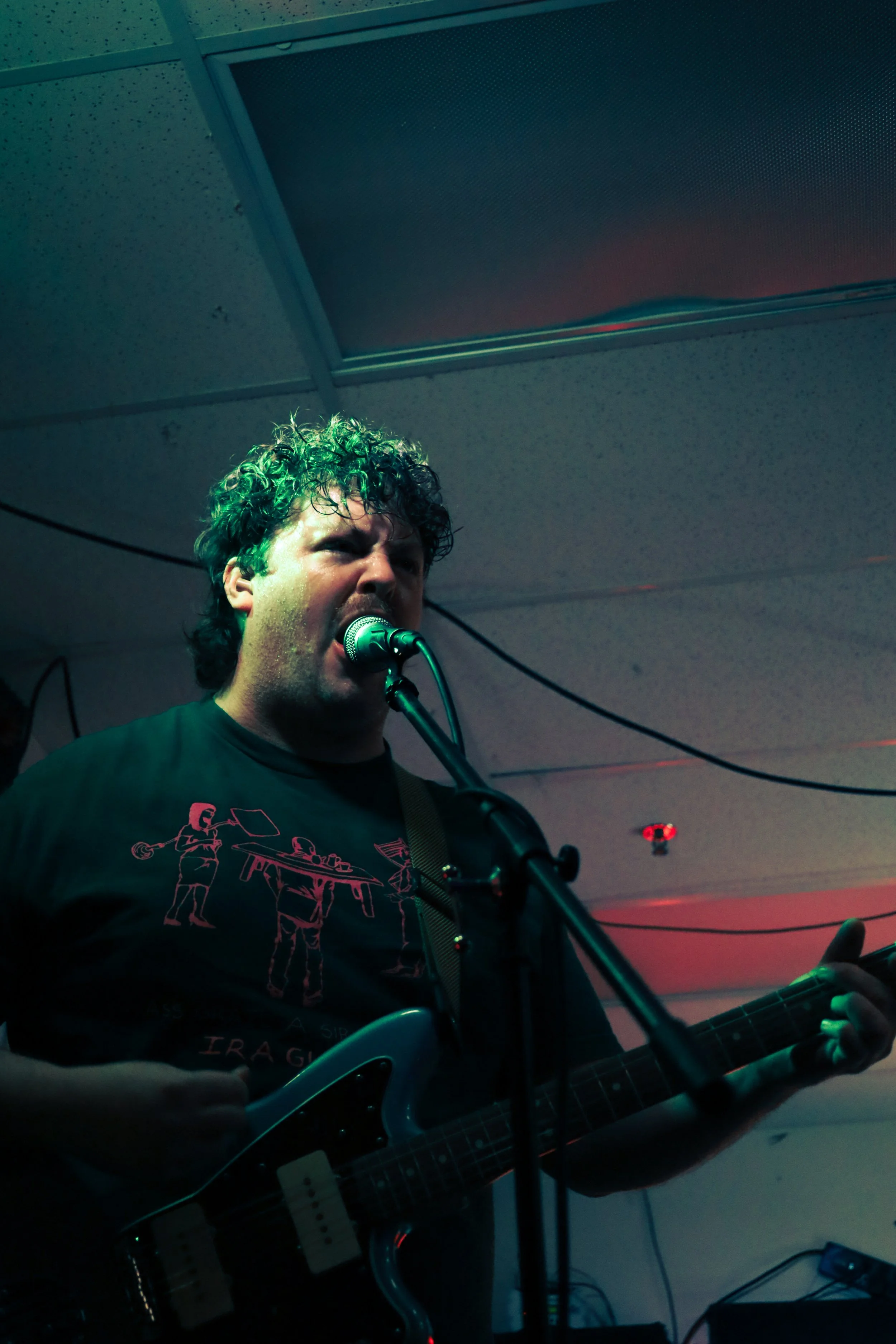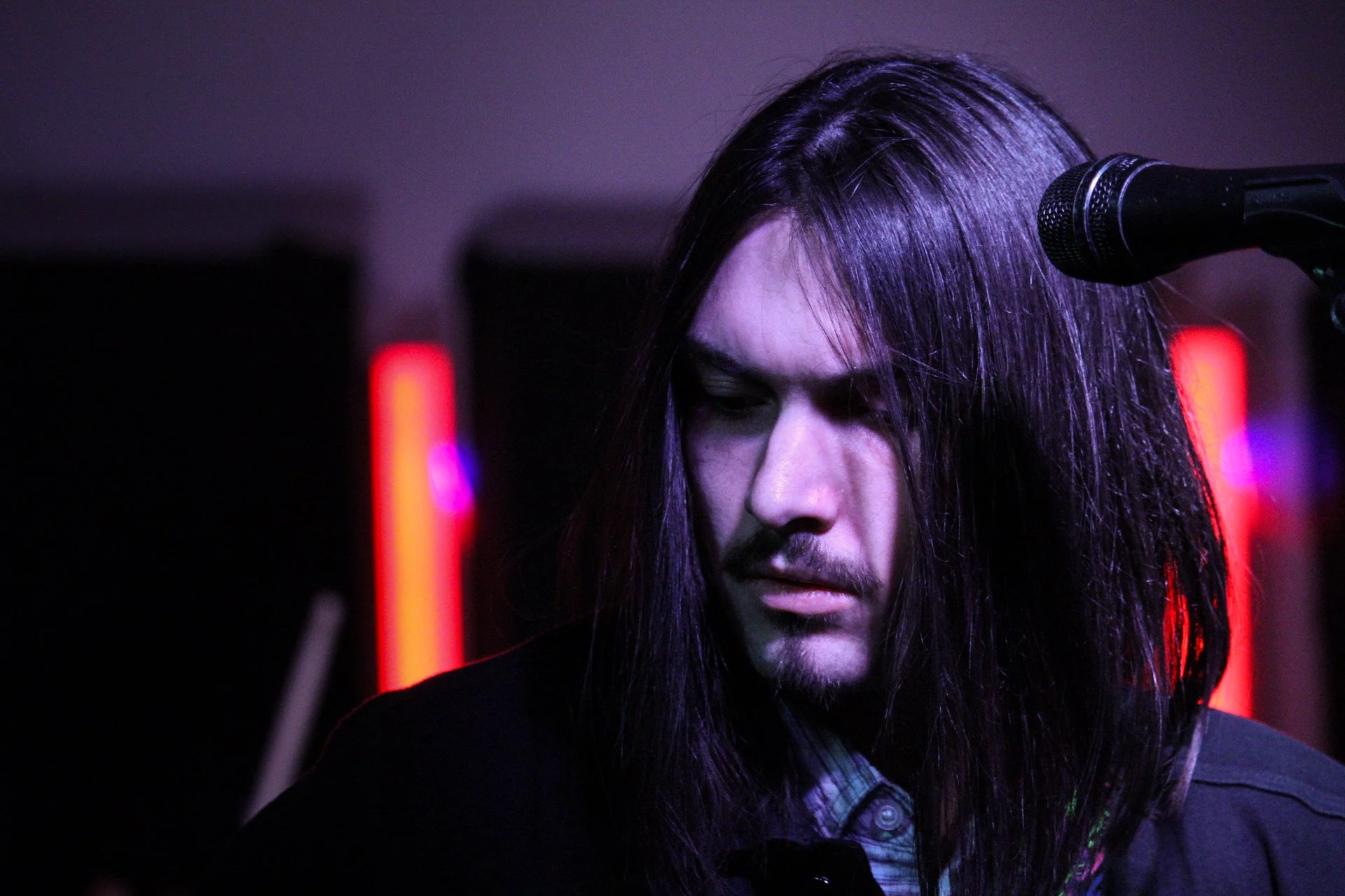A man with long dark hair and a beard is performing with a microphone nearby, under purple and red lighting.