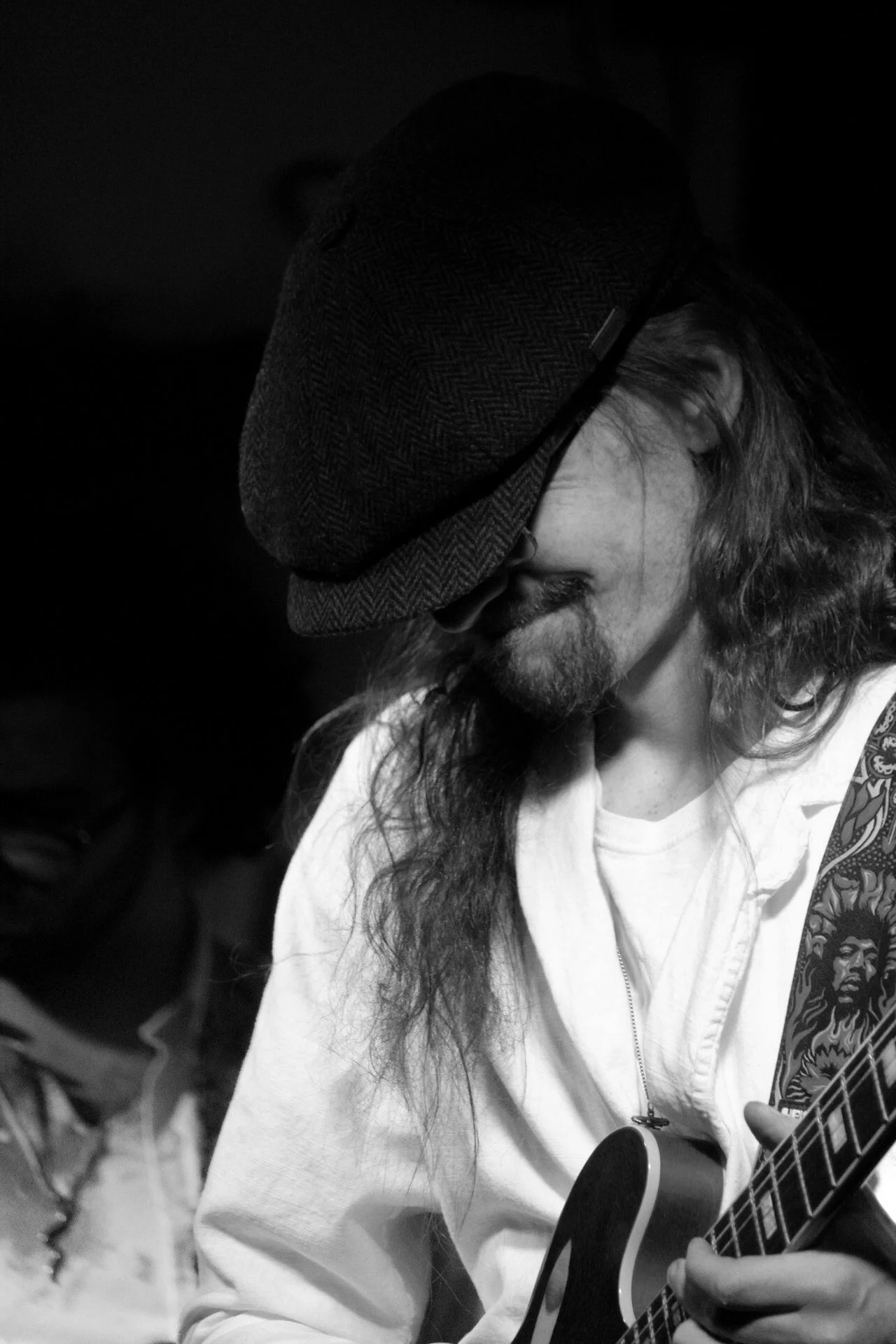 A man wearing a hat and glasses, with long hair and a beard, playing an electric guitar.