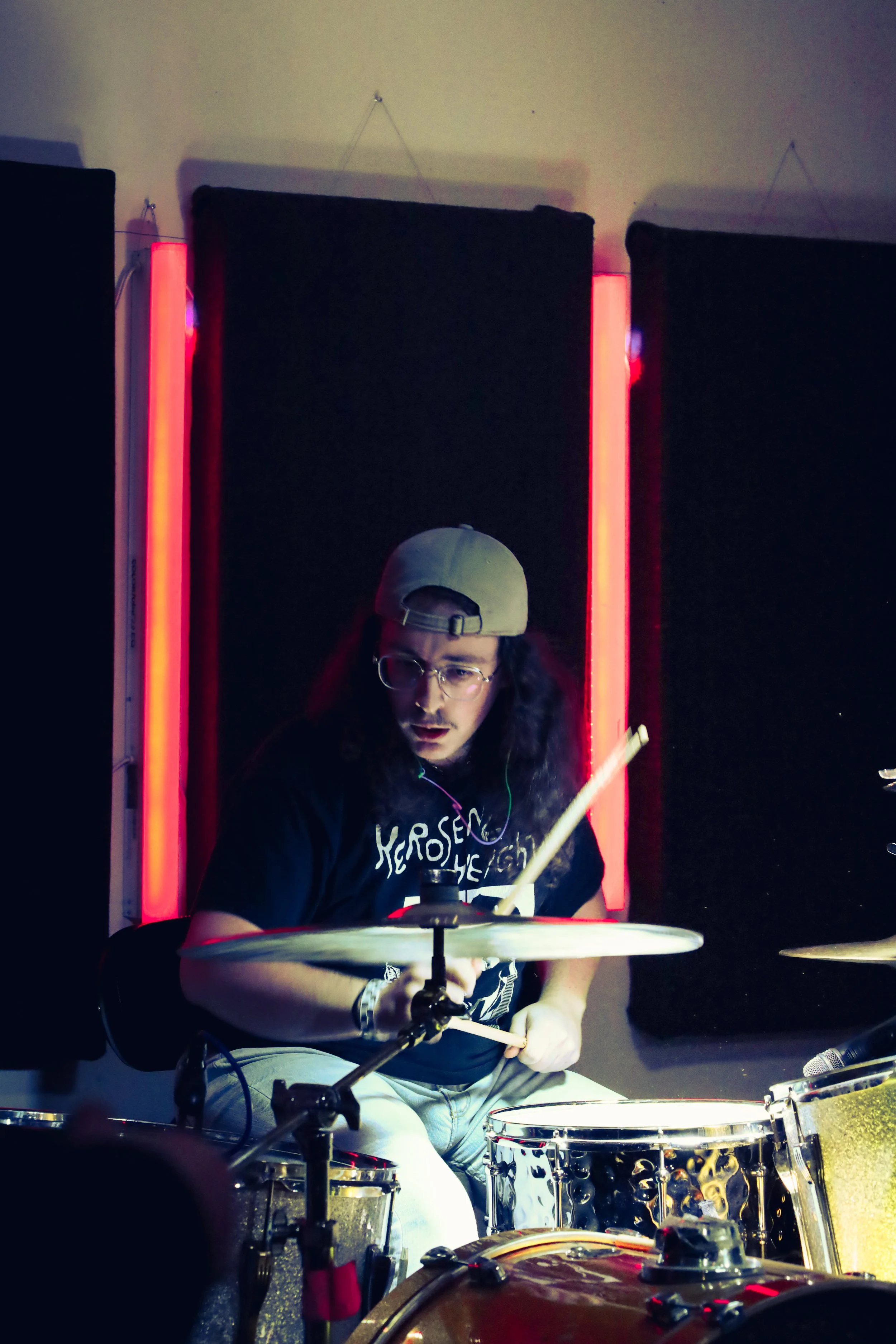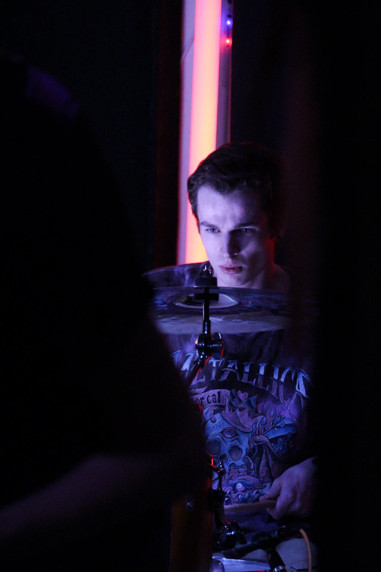 A young man with short brown hair playing drums in a dark setting with purple and red lighting.