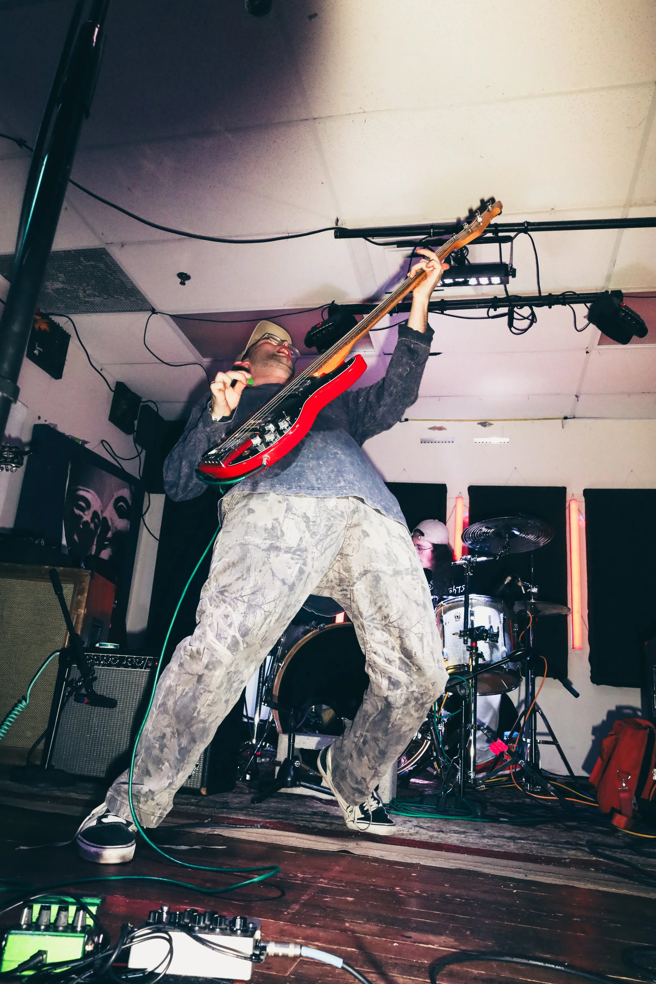 Guitarist playing electric guitar on stage with drummer in background at a live music venue.