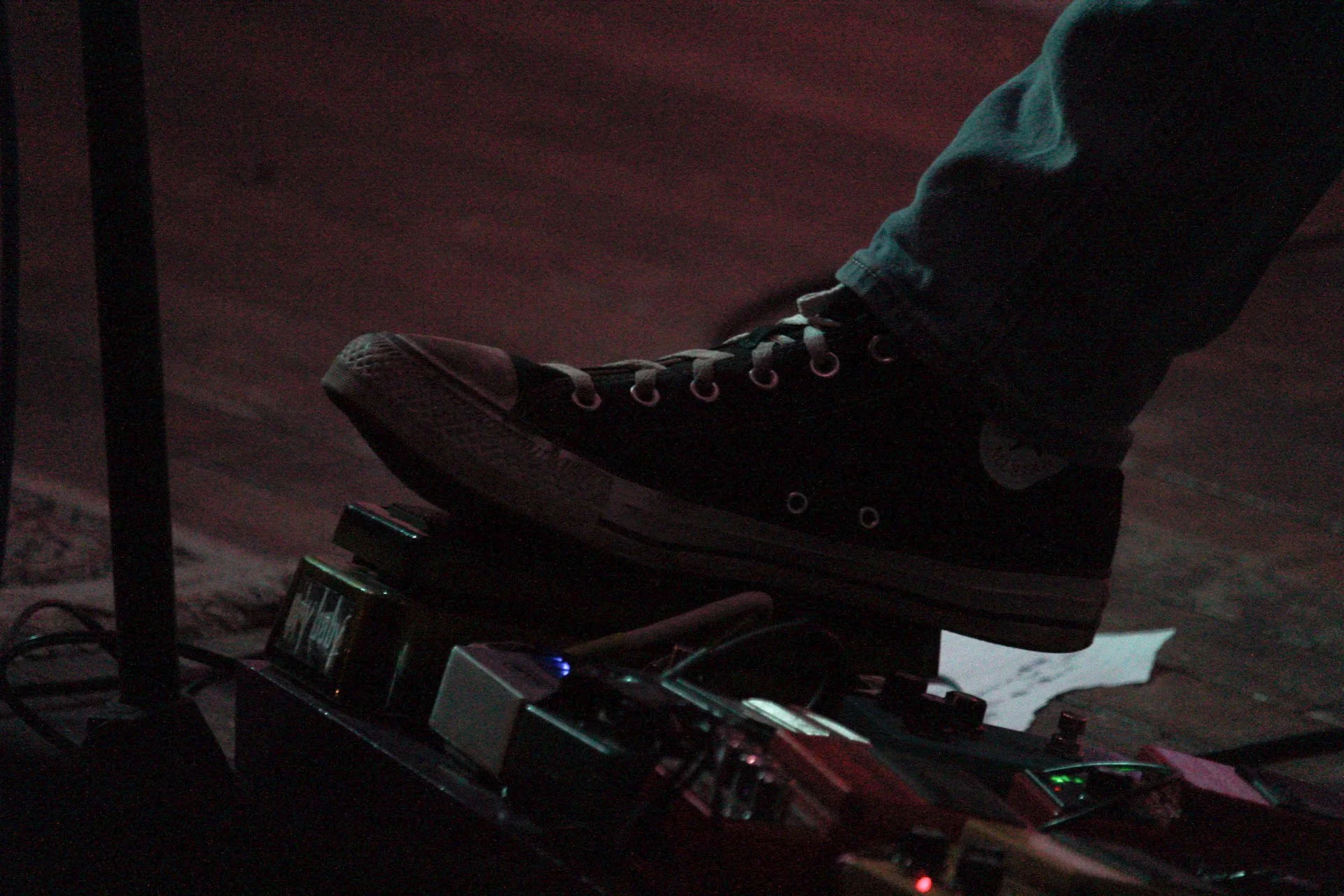 Close-up of a black high-top Converse sneaker on a person's foot, positioned above a row of guitar pedals on a dark stage or music setup.