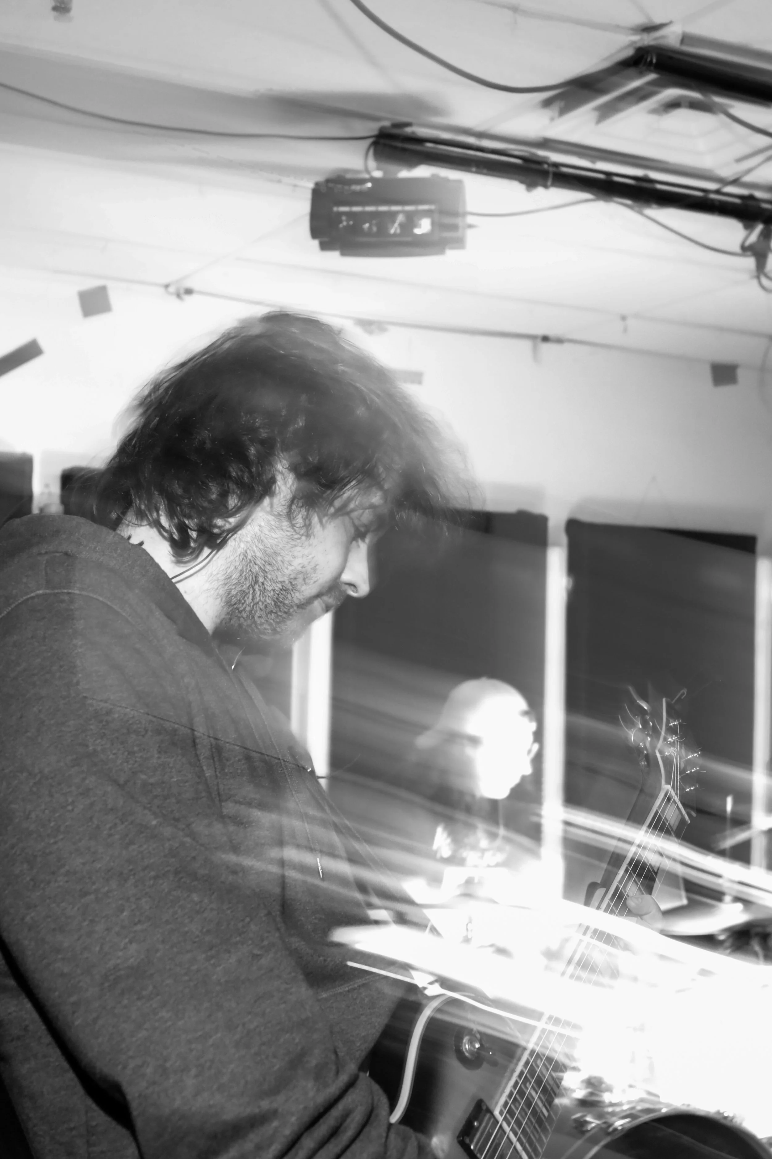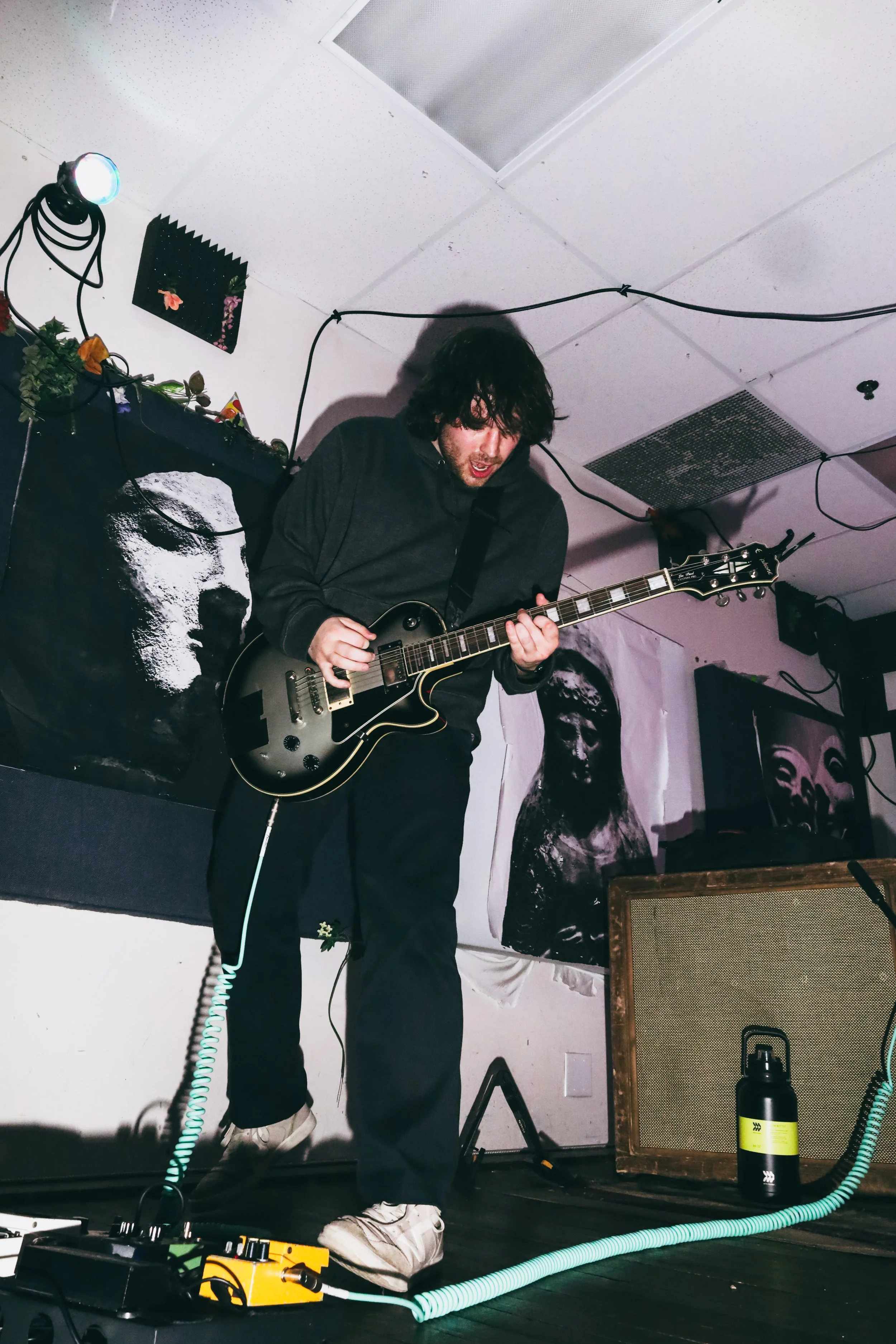 A musician with dark hair and a beard playing an electric guitar on stage. He is wearing a black hoodie, black pants, and white shoes. Behind him are black and white posters of faces and some plants, with electrical cords hanging from the ceiling.