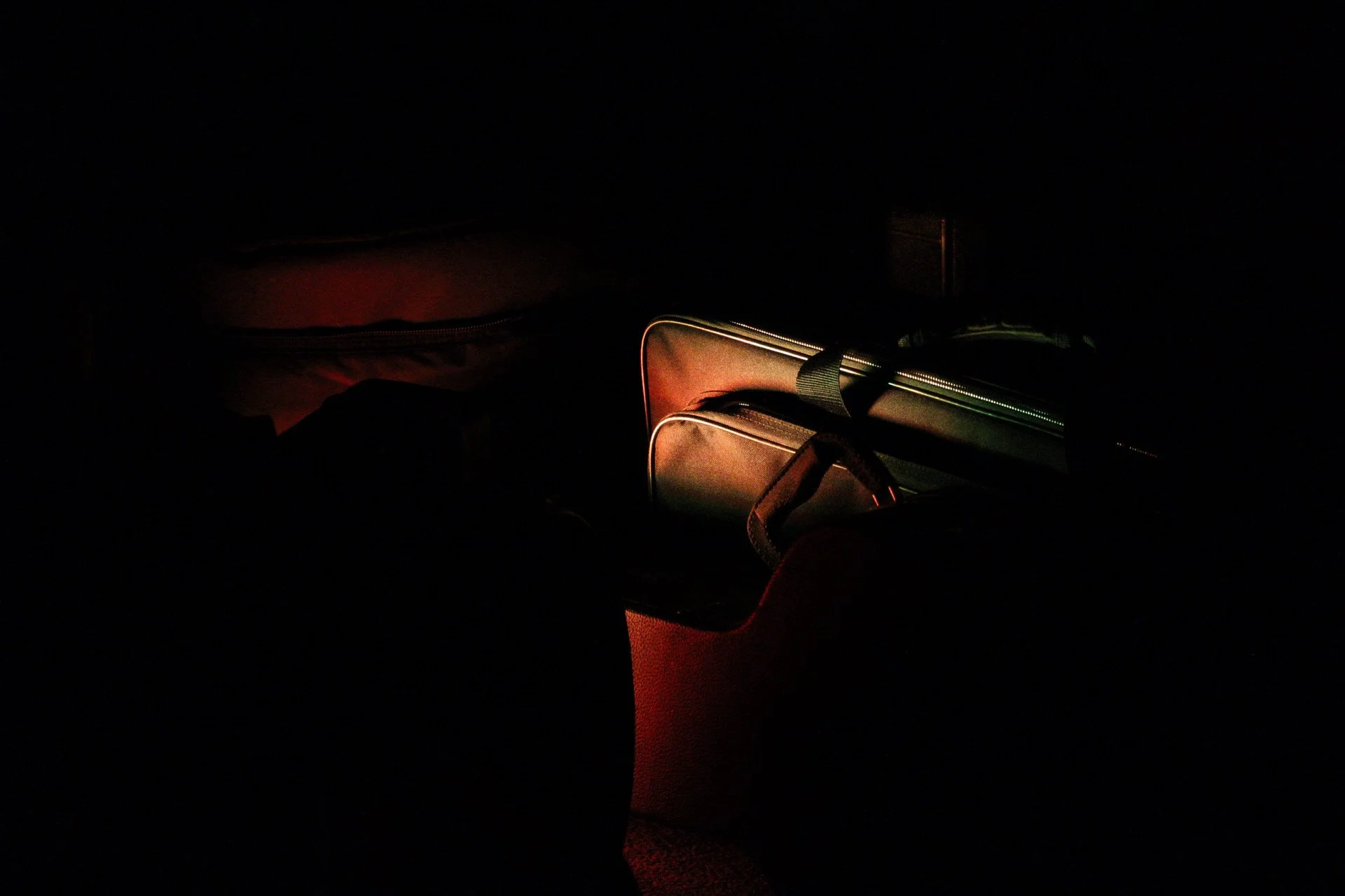 Dark image showing a suitcase with a strap and possibly some clothing or items, with a faint glow of colored light reflecting off the surface.