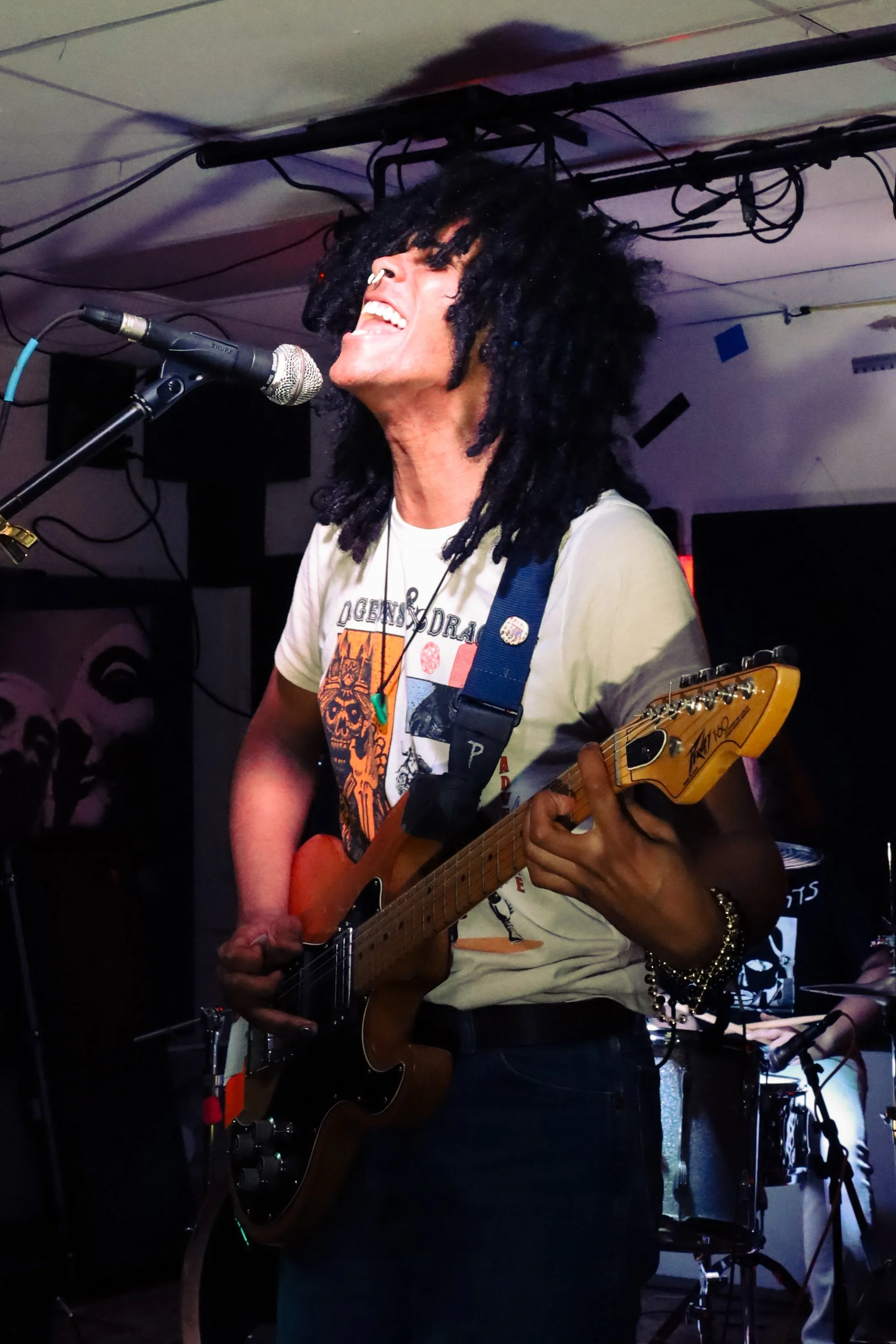 A male musician with curly black hair and a nose ring singing into a microphone while playing an electric guitar on stage.