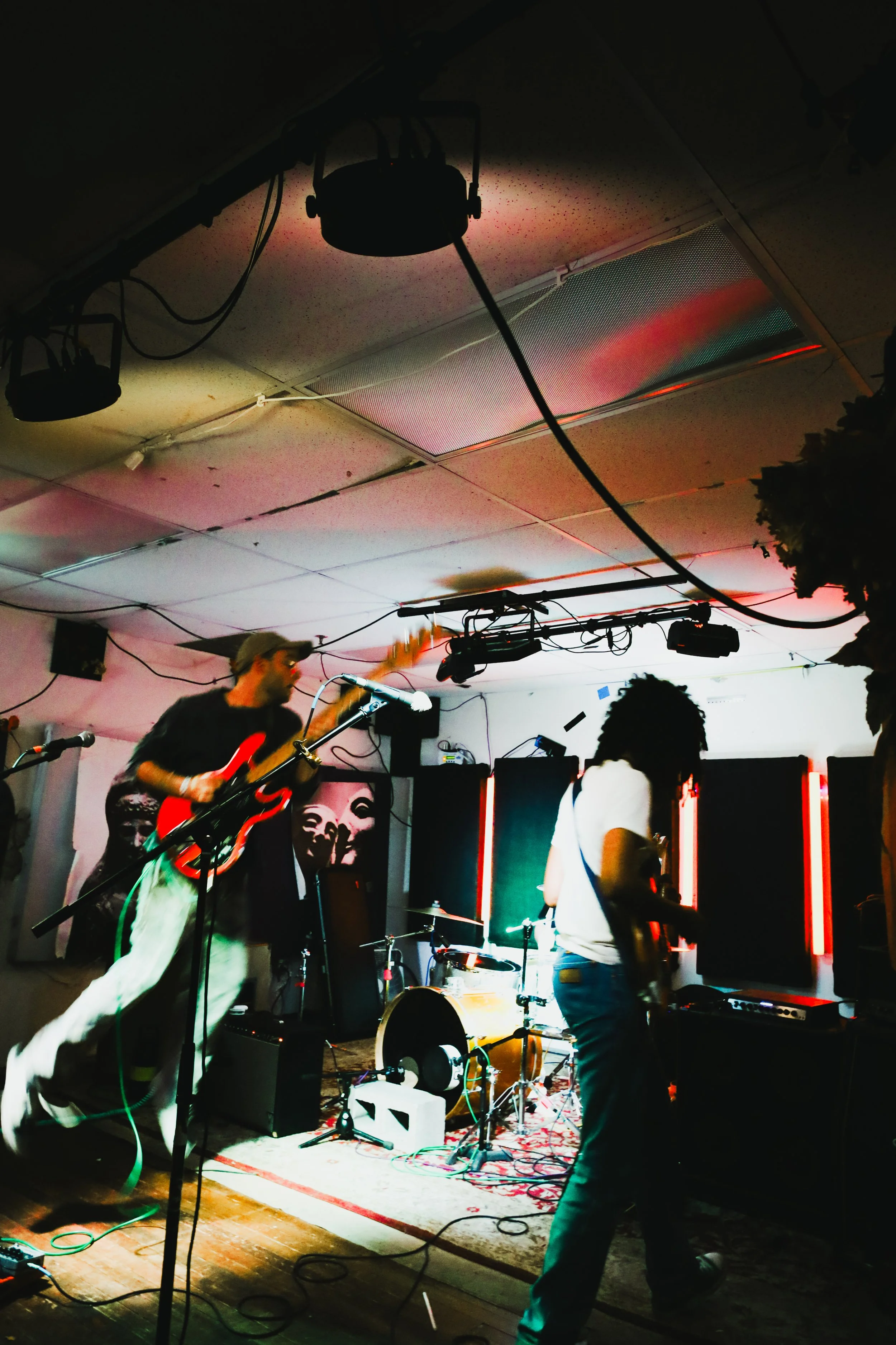 Musicians performing on stage in a dimly lit venue with colorful lighting, drum set, and guitar equipment.