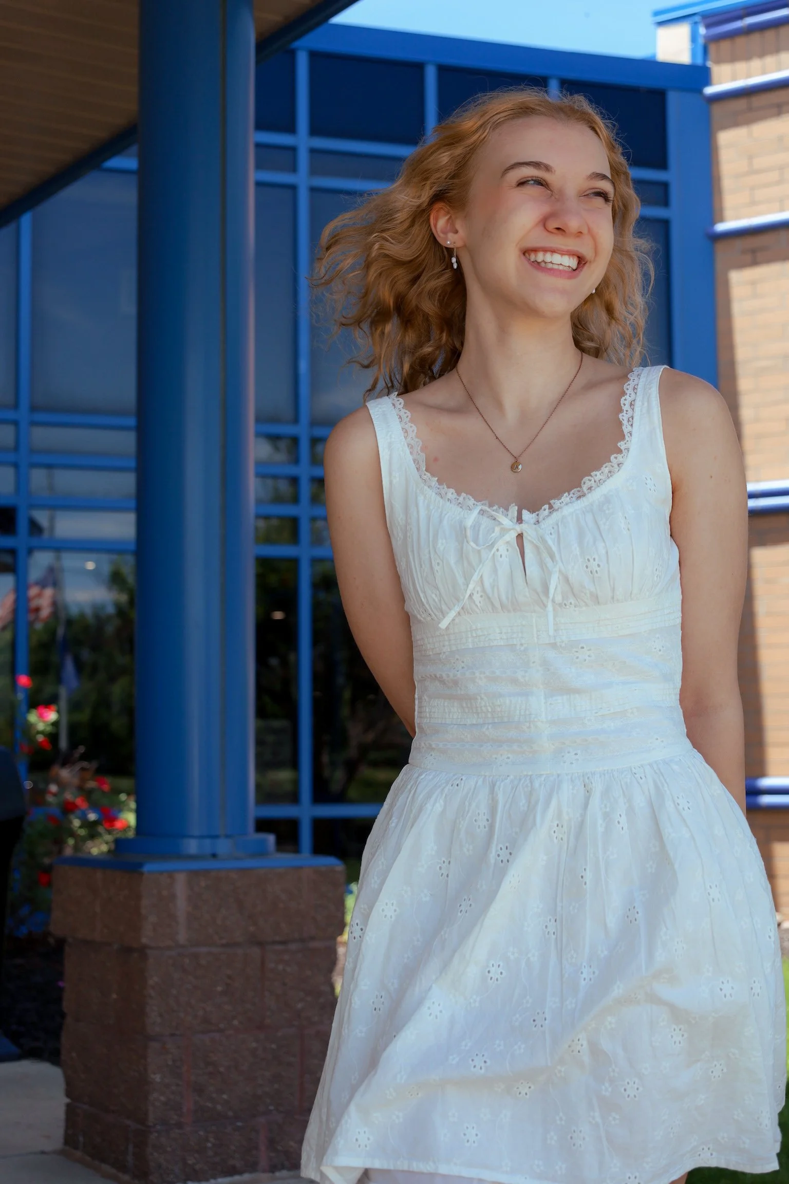 A young woman with curly red hair smiling outside in a white sleeveless dress with lace details.