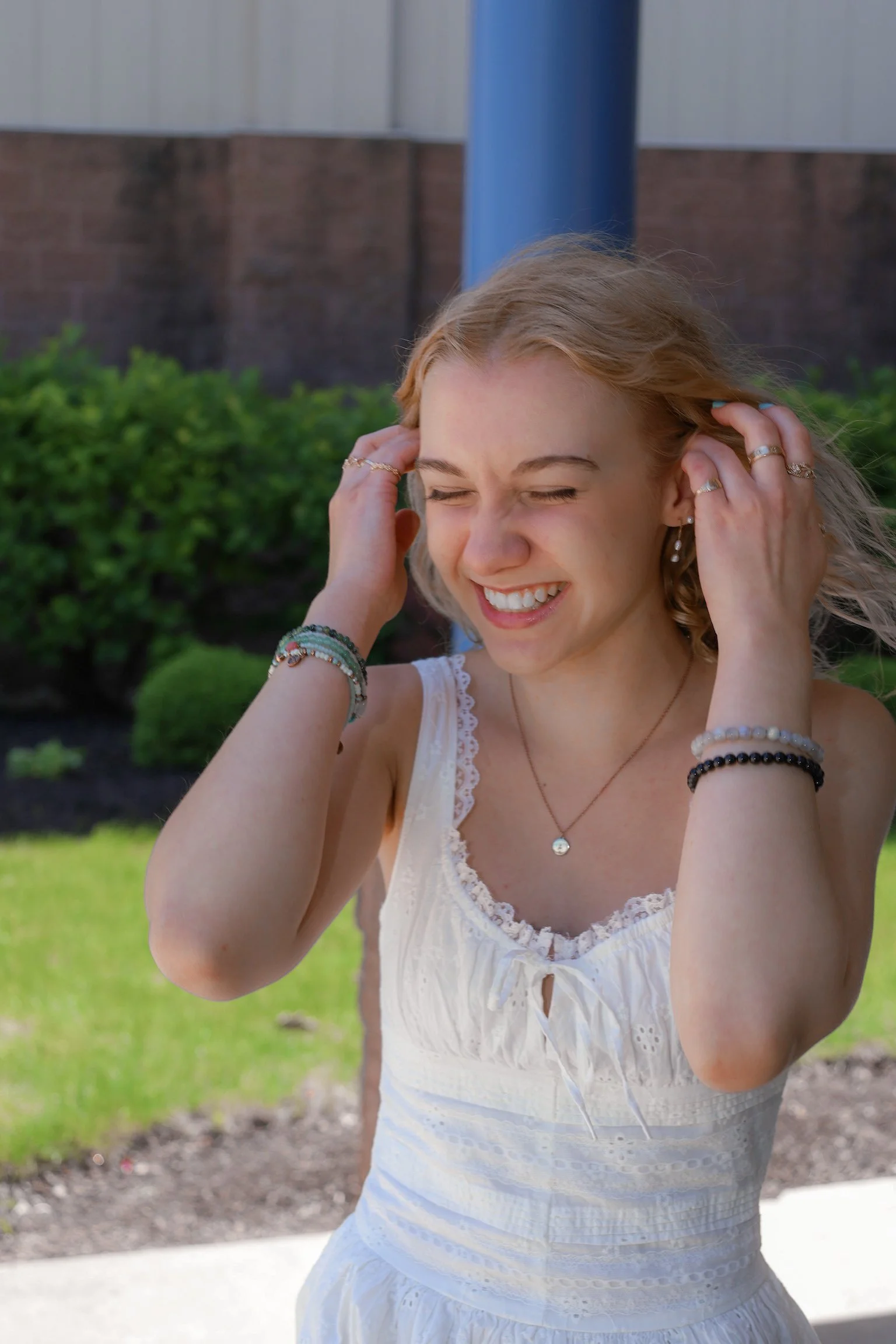 A young woman with blonde hair smiling and holding her head with both hands outdoors, wearing a white sleeveless dress and jewelry.