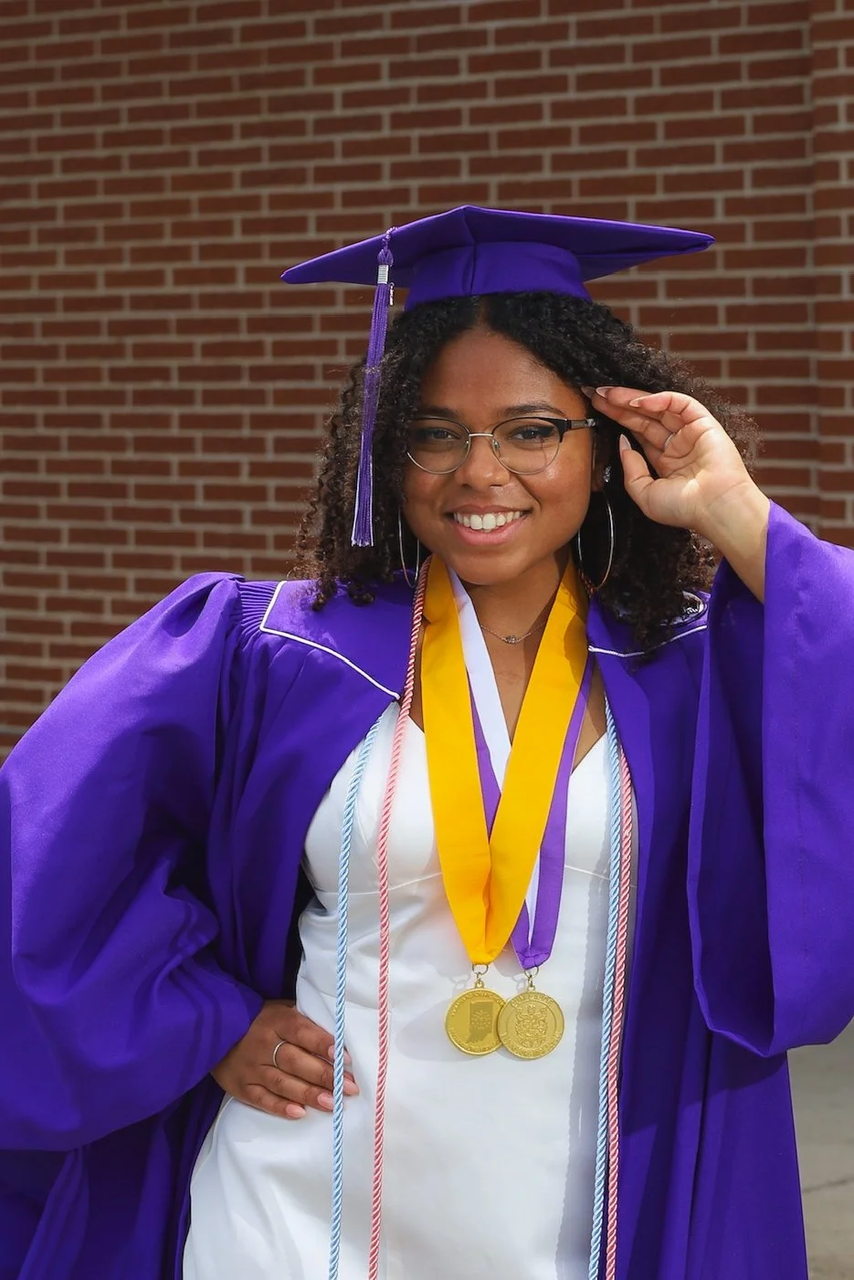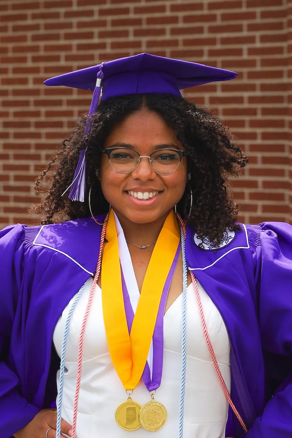 A young woman wearing a purple graduation cap and gown, with multilayered necklaces, eyeglasses, and medals, standing in front of a brick wall and smiling. View fullsize