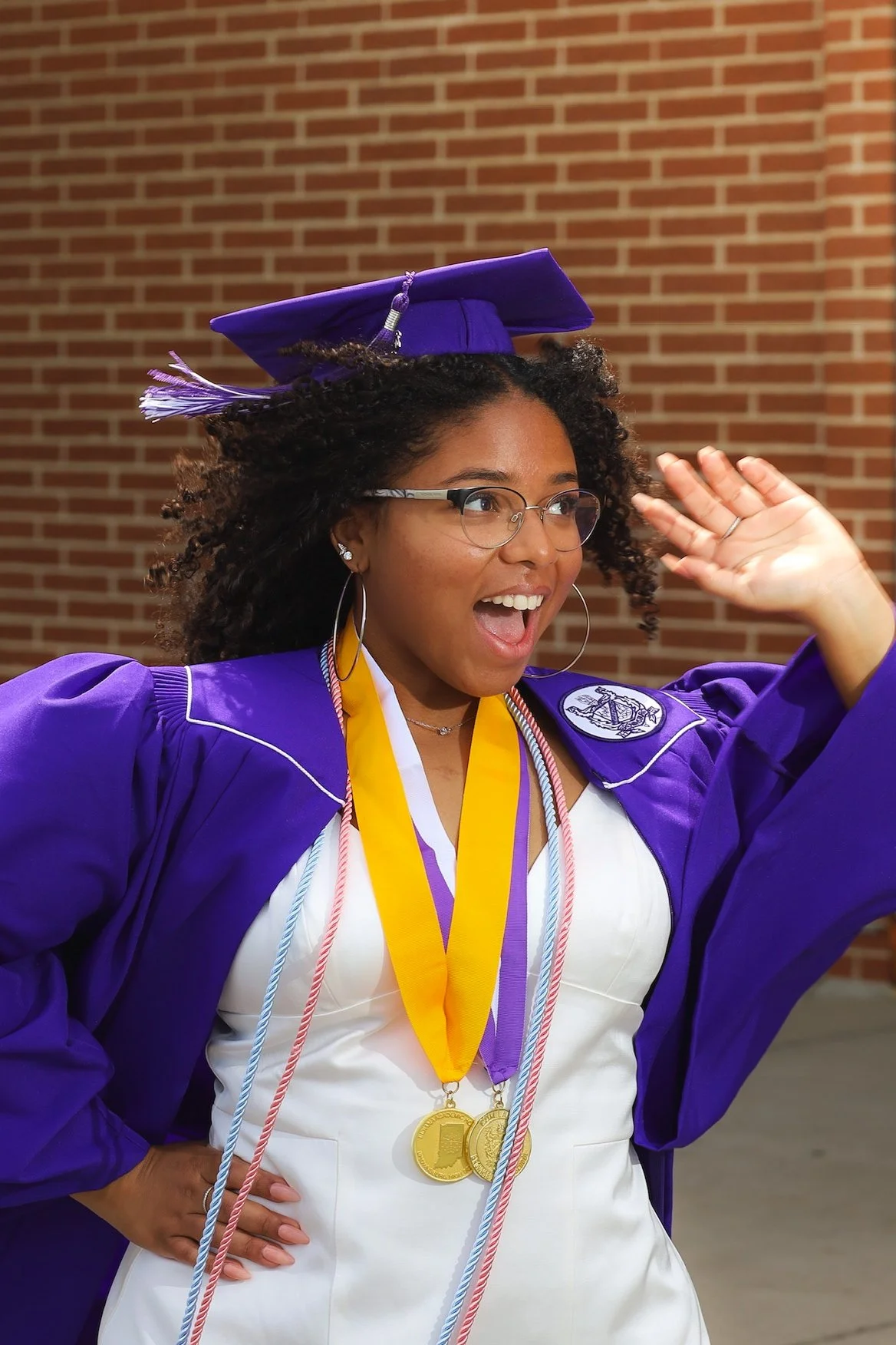 A woman in a white dress and purple graduation gown and cap, wearing gold medals and cords, smiling and waving with her right hand against a brick wall background. View fullsize