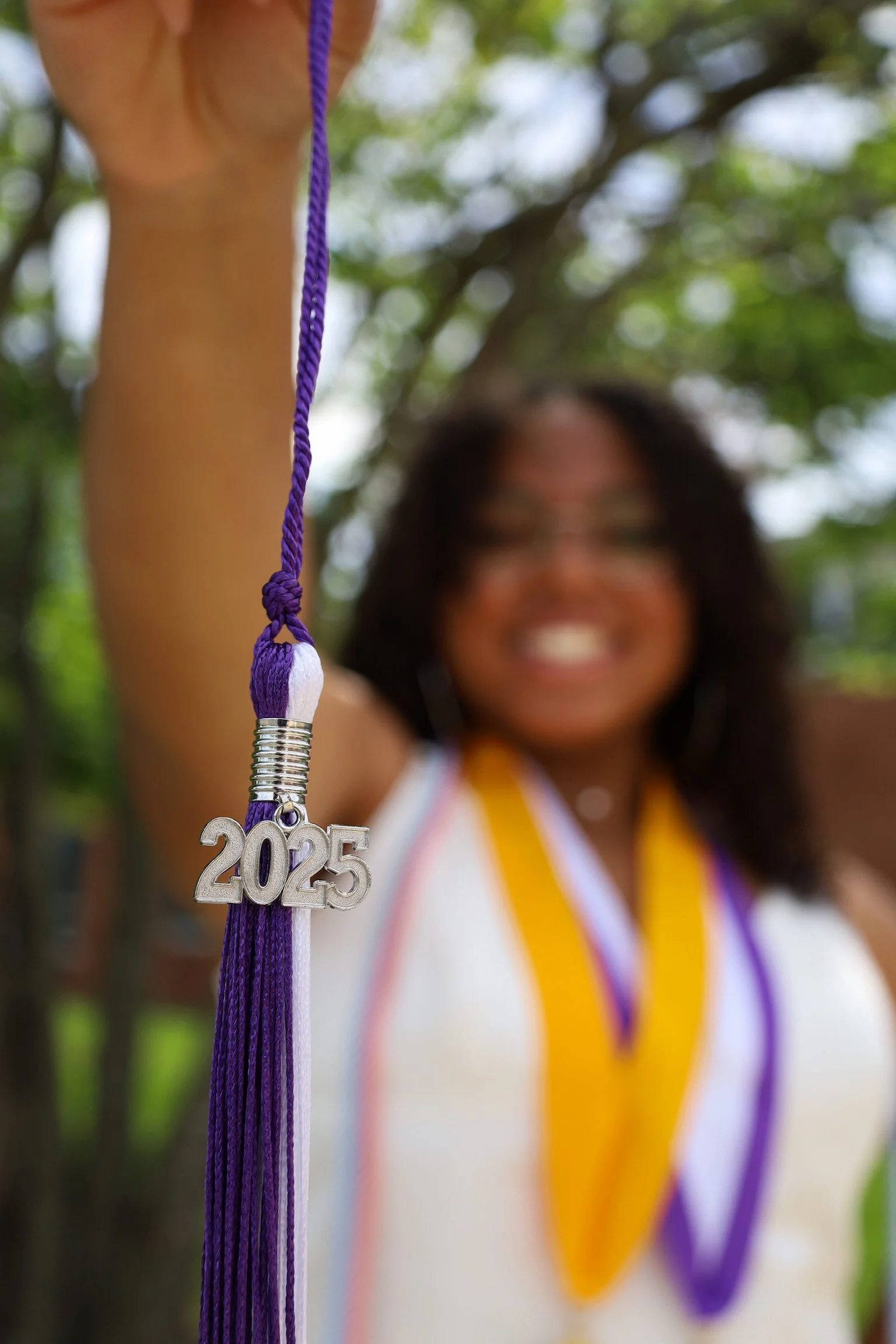 Close-up of a graduation tassel with a silver '2025' charm, held by a graduate, with the graduate's smiling face blurred in the background, outdoors with trees. View fullsize