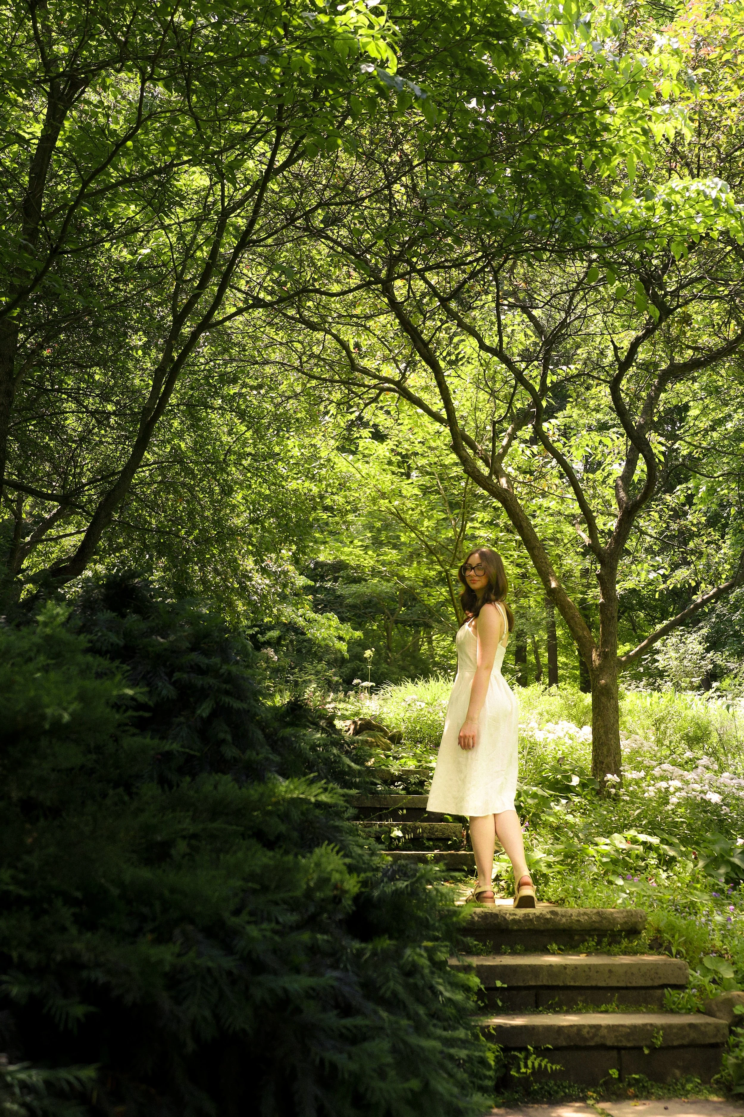 A woman in a white dress standing on stone steps in a lush, green garden with trees and plants.