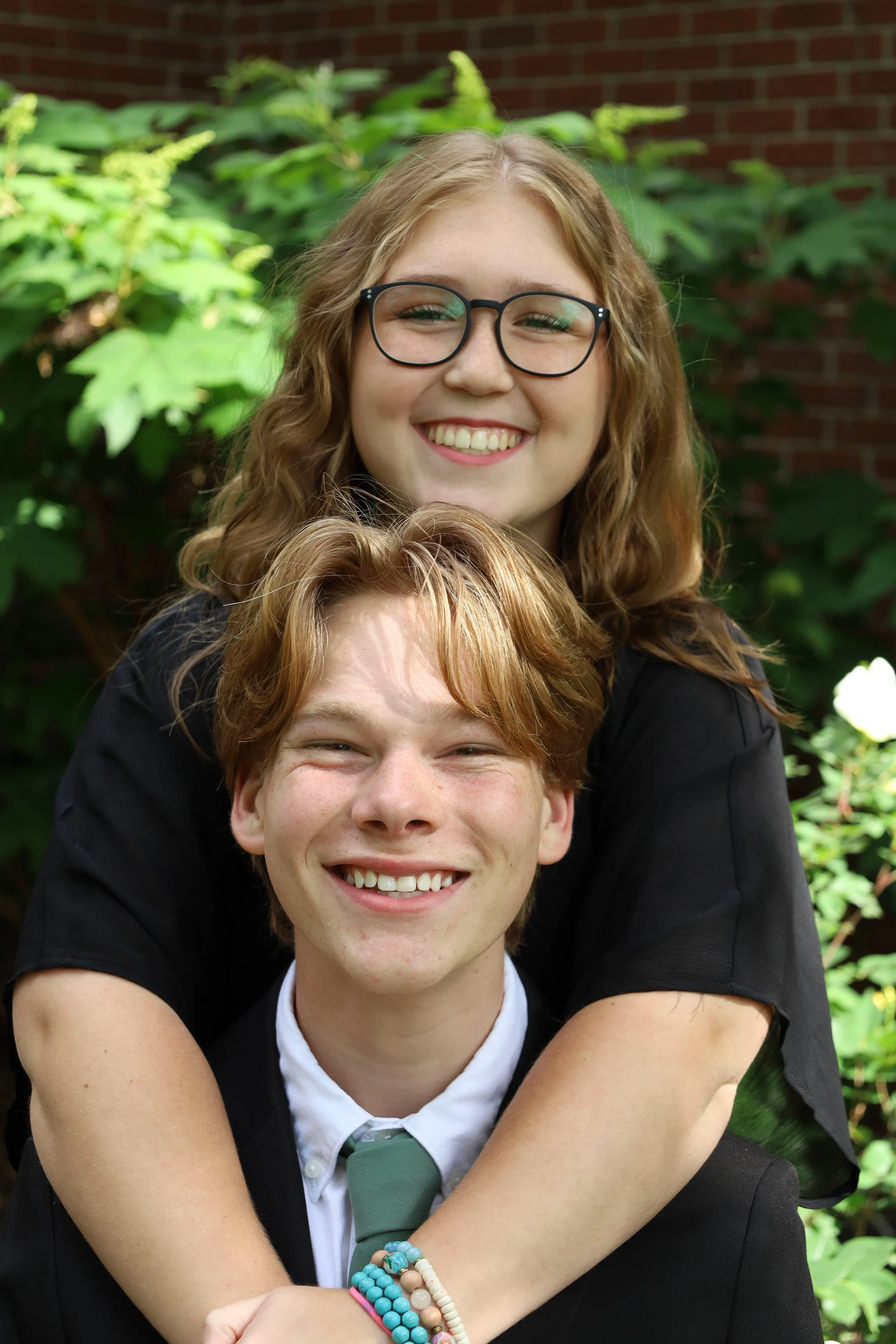 A young woman with glasses and curly hair smiling, hugging a young man with red hair and freckles, both outdoors with green foliage in the background. View fullsize