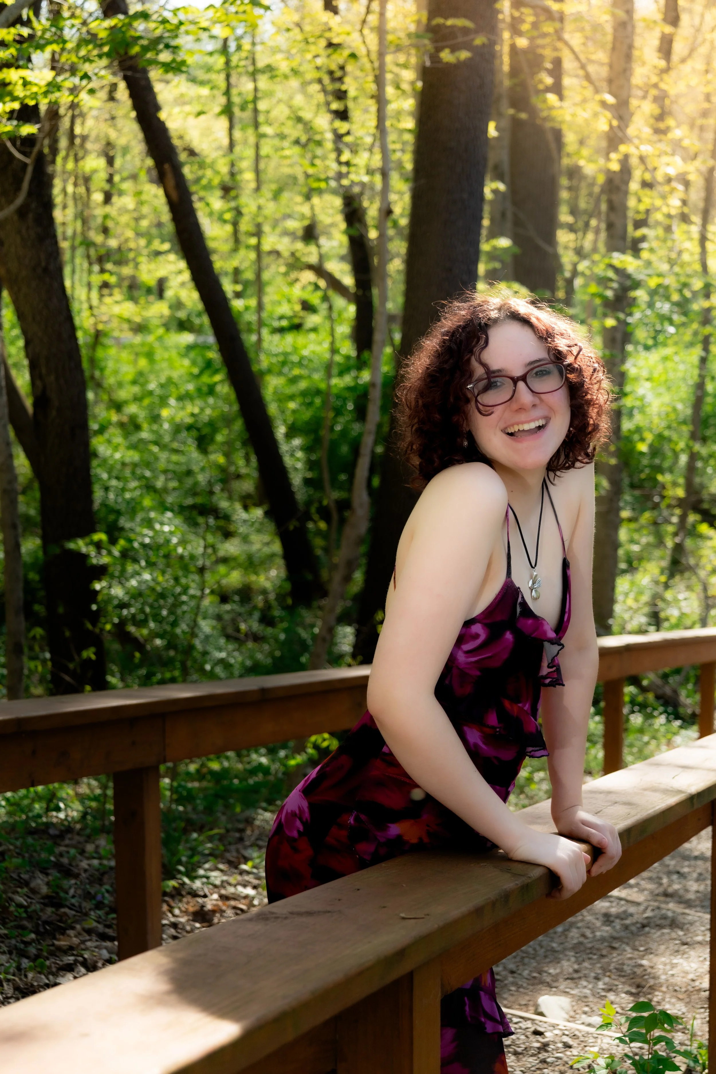 A young woman with curly brown hair, wearing glasses and a purple dress, is smiling and leaning on a wooden railing in a forested area with sunlight filtering through the trees. View fullsize