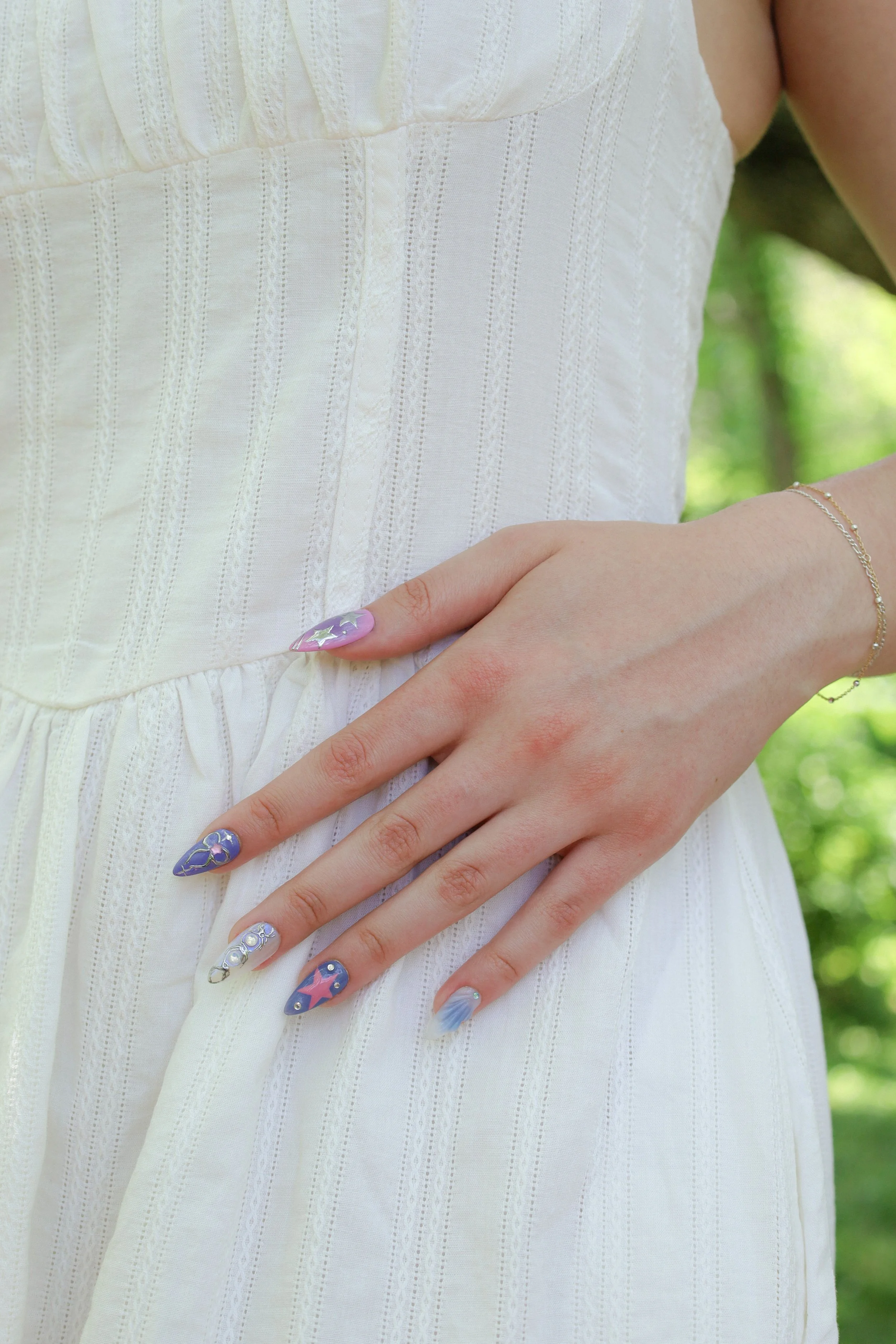 A woman's hand resting on her waist, wearing a white dress with textured vertical lines and decorated with colorful, patterned nail art. View fullsize