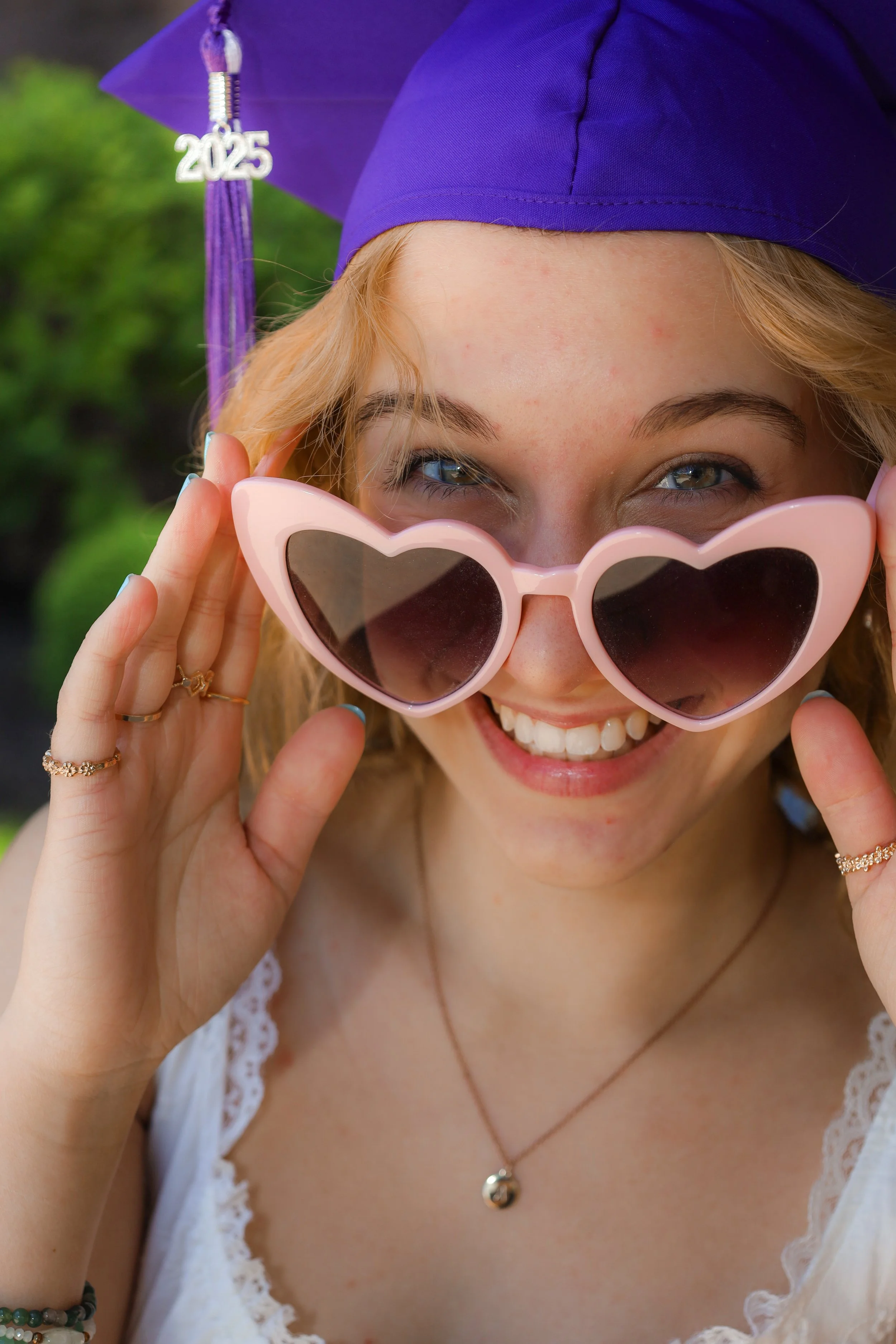 A woman smiling and wearing pink heart-shaped sunglasses and a purple graduation cap with a '2025' charm. She is outdoors with green foliage in the background. View fullsize