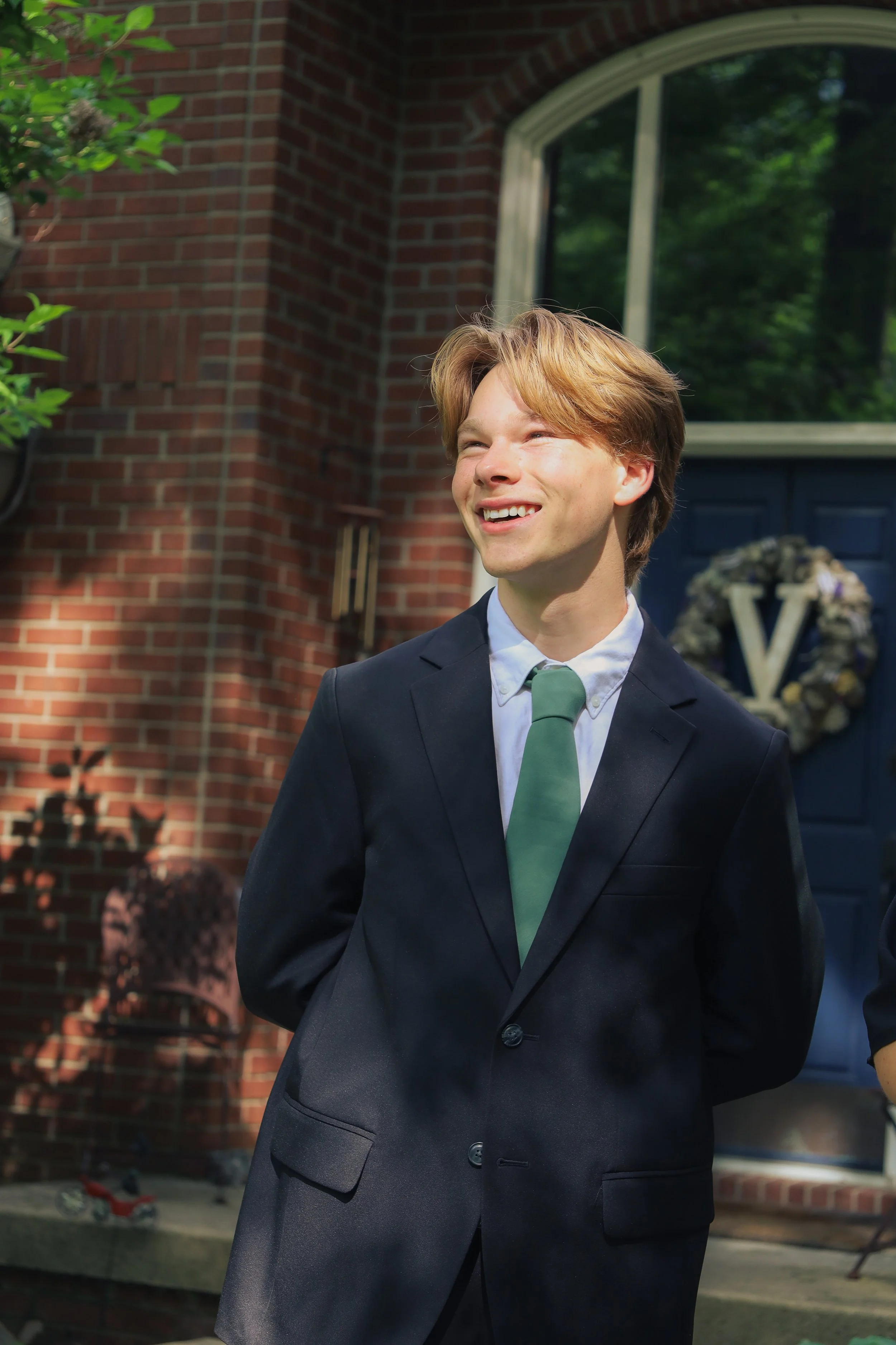 A young man in a black suit and green tie standing outside a brick house with a wreath on the door, smiling.