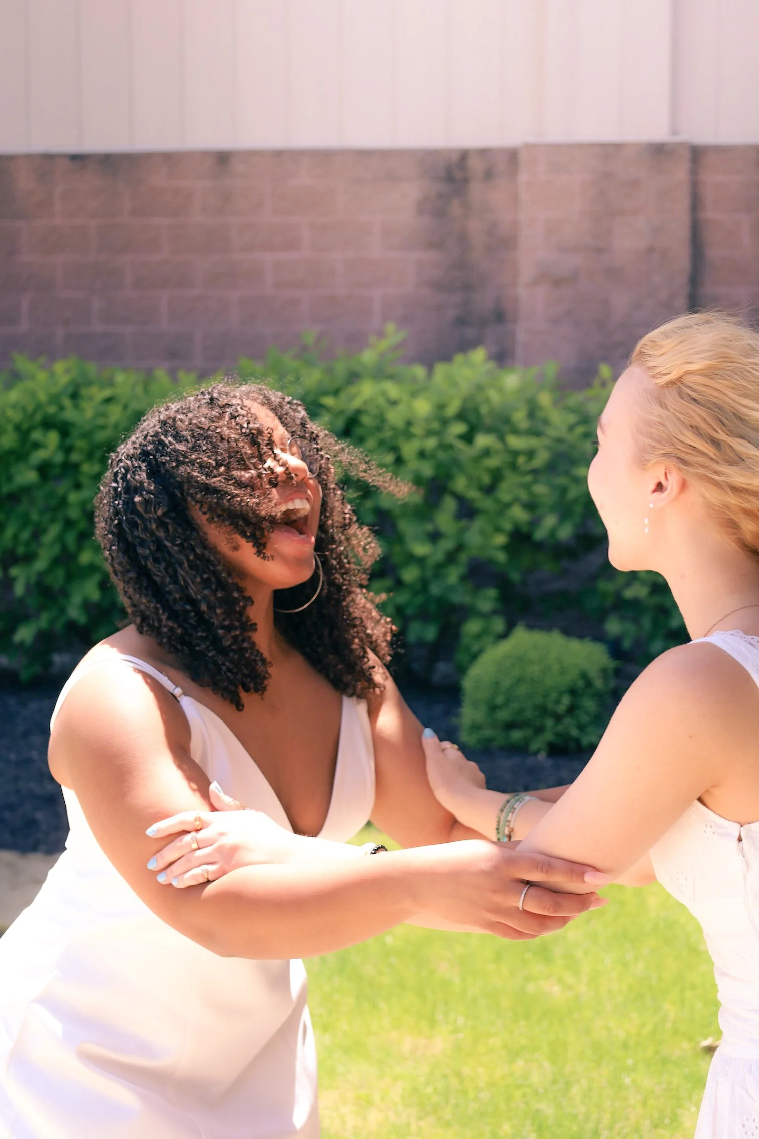 Two women are outdoors, smiling and holding each other by the arms, with bushes and a brick wall in the background.