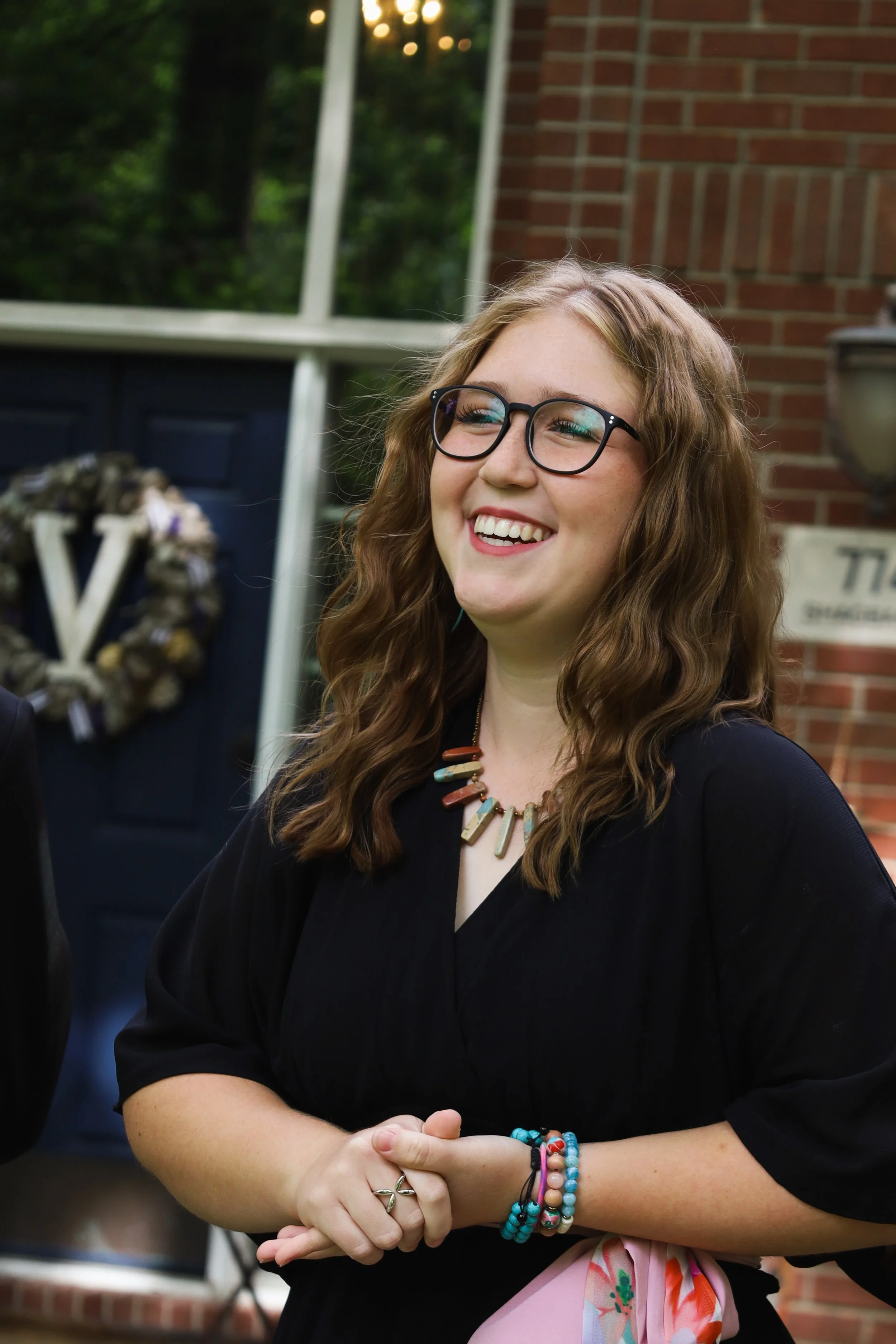 A young woman with curly brown hair, glasses, and light skin smiling outdoors. She is wearing a black top, colorful beaded jewelry, and standing in front of a brick wall with a wreath and a sign that says 'The' in the background. View fullsize