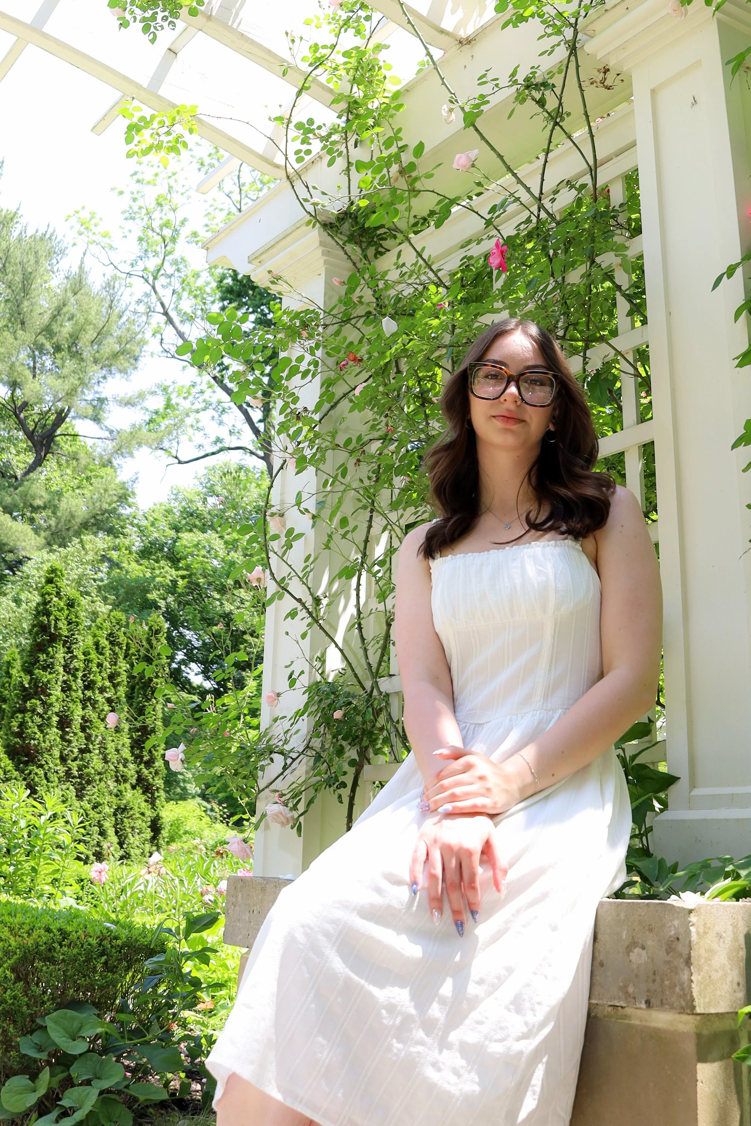 A young woman with glasses and wavy brown hair, wearing a white dress, sitting on a stone bench in a garden with lush green plants and flowering pink roses, under a white pergola on a sunny day.