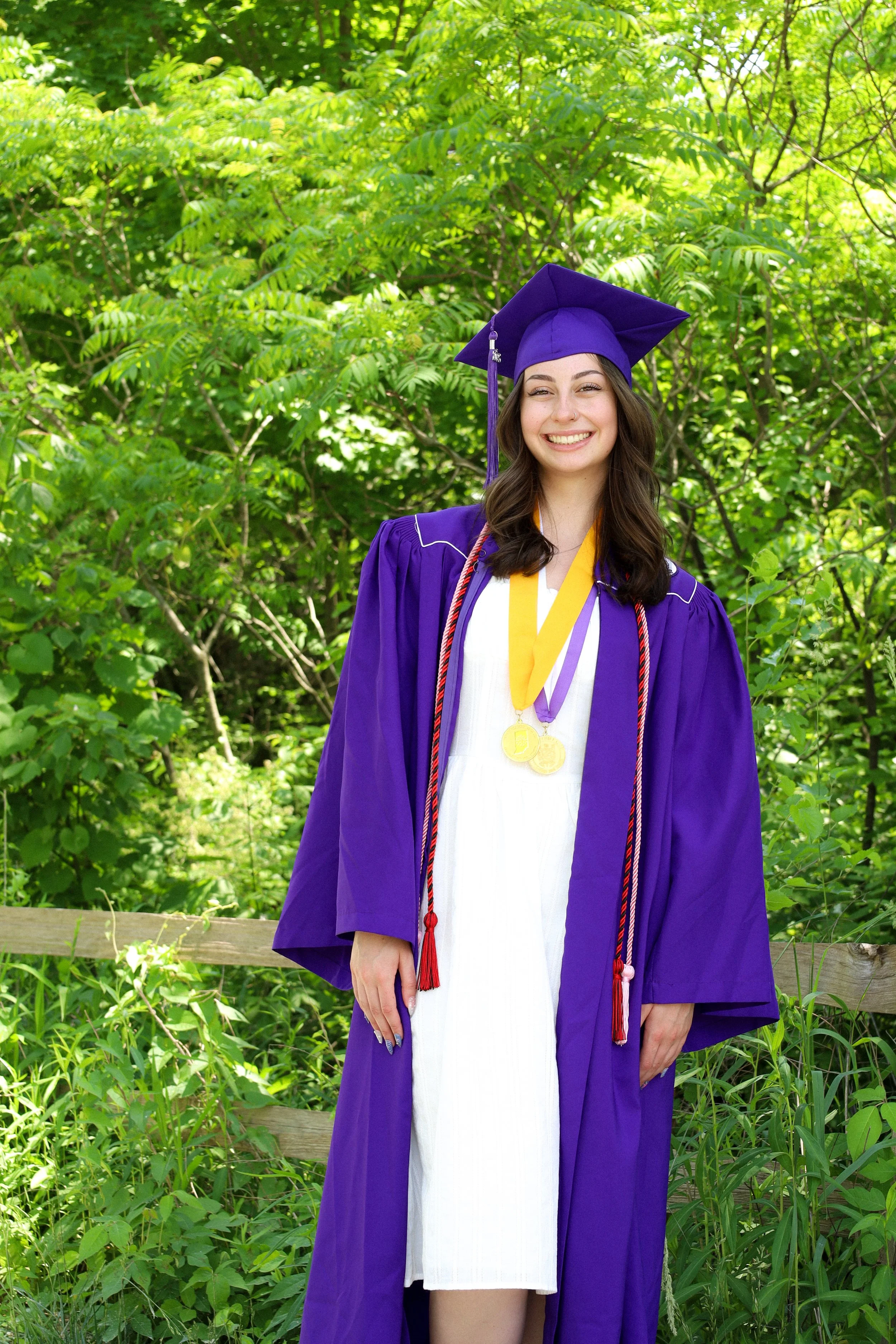 A woman wearing a white dress, purple graduation cap and gown, with medals around her neck, standing outdoors in front of green trees, smiling. View fullsize