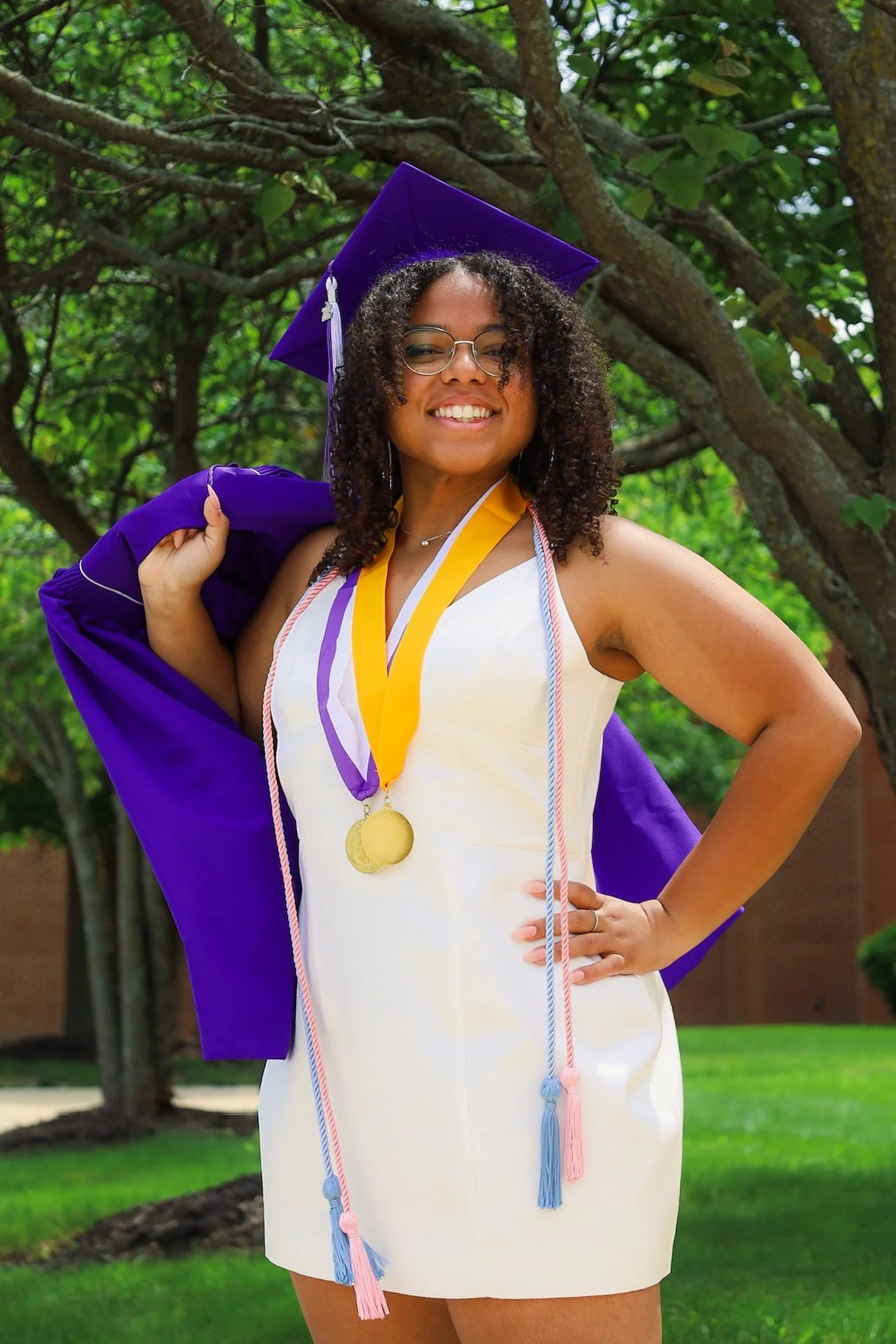 A woman wearing a white dress, purple graduation cap and gown, with medals around her neck, standing outdoors in front of green trees, smiling.