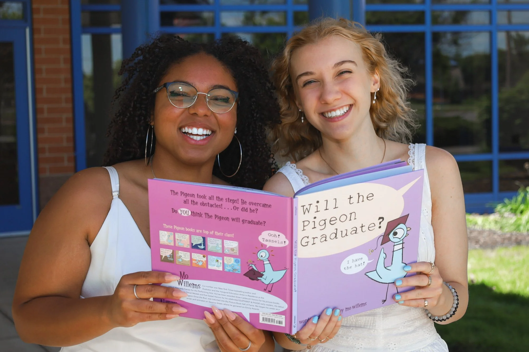 Two smiling women outdoors, holding an open children's book titled 'Will the Pigeon Graduate?', in front of a blue building with glass windows. View fullsize