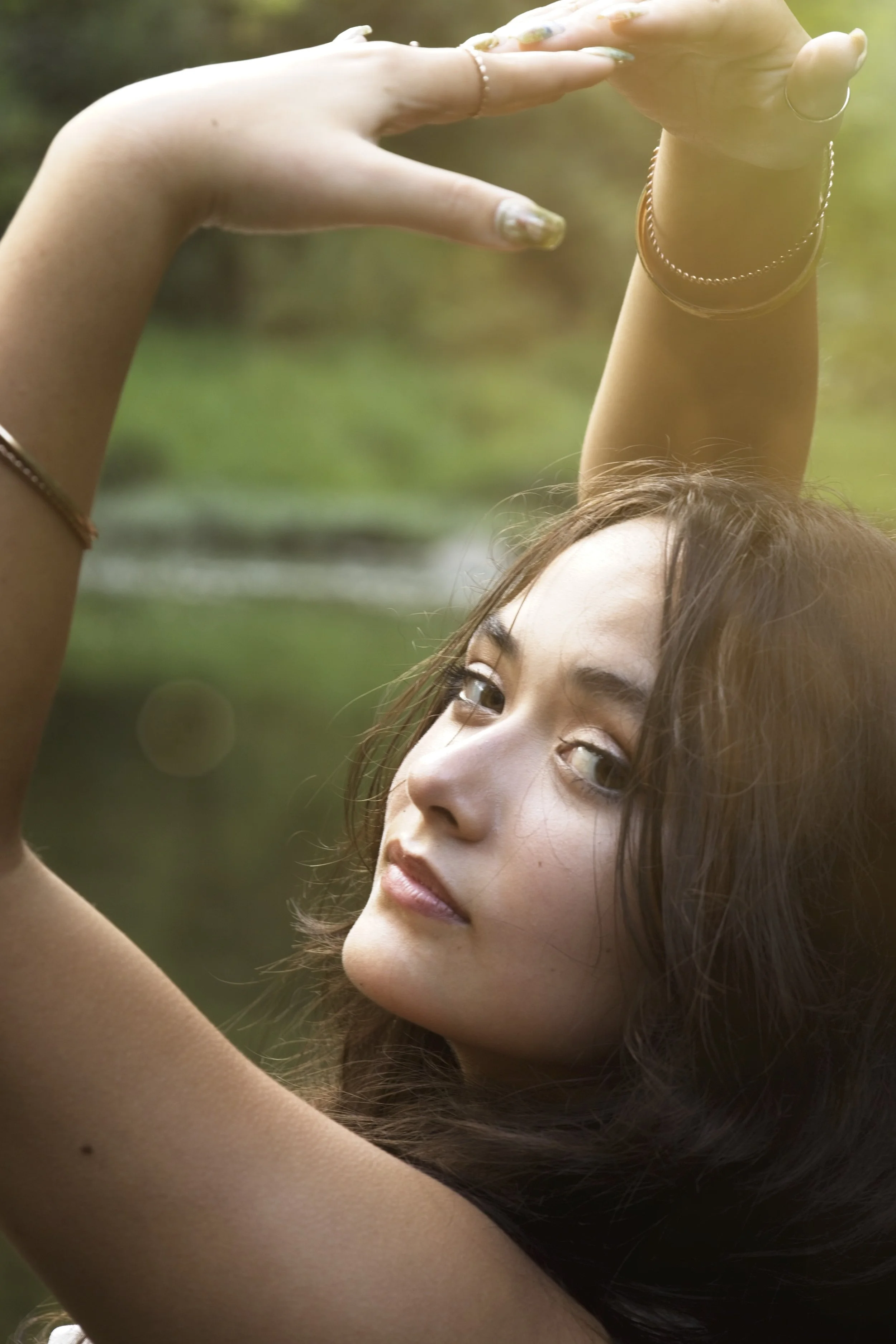 A young woman with long brown hair poses outdoors, looking at the camera with partially closed eyes, with her arms raised and hands near her forehead, against a blurred green and yellow background. View fullsize