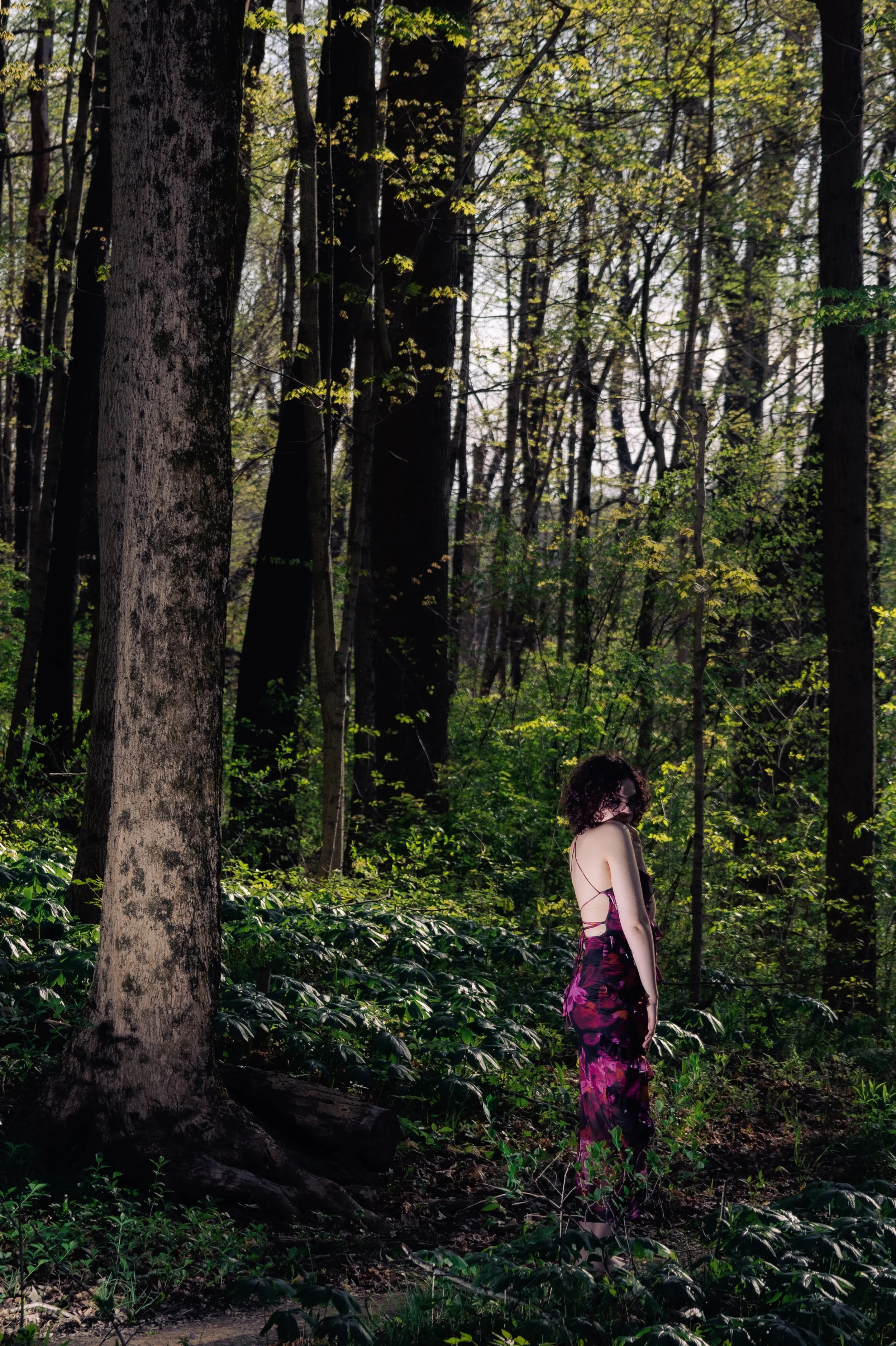 A woman in a purple floral dress standing in a forest with tall trees and green foliage. View fullsize