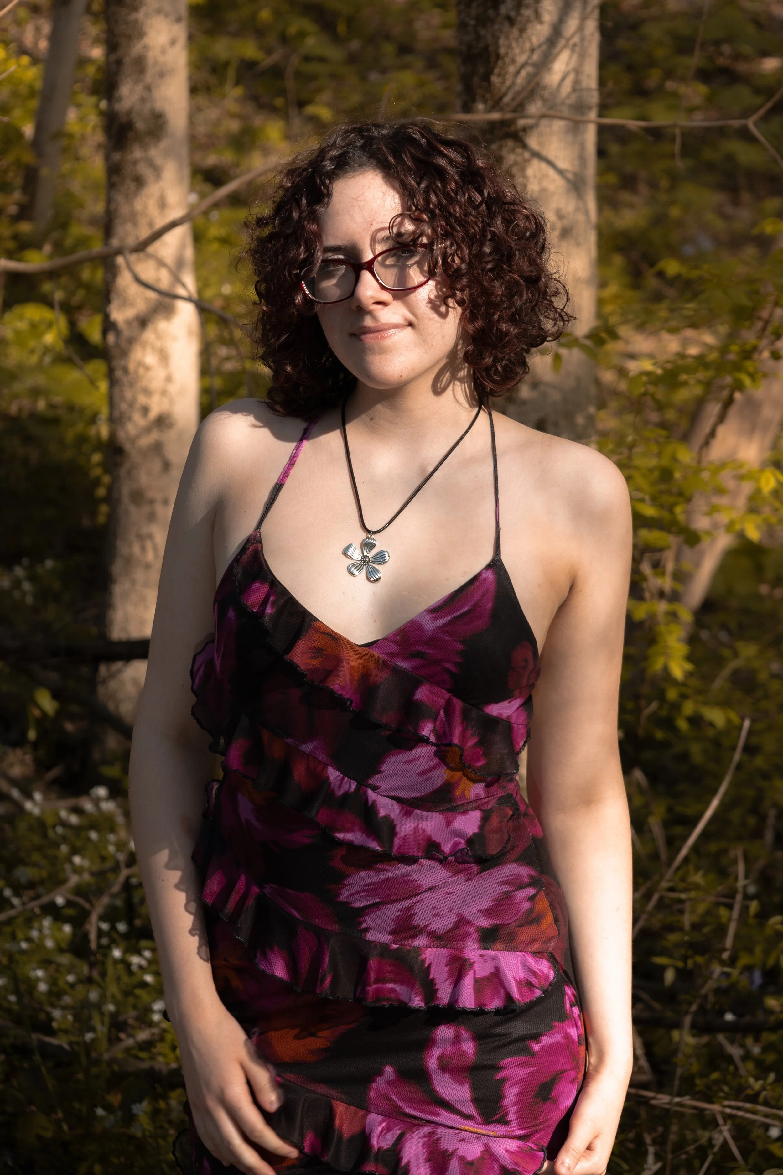 A woman with curly brown hair and glasses standing outdoors in a wooded area during daylight. She is wearing a purple and black floral dress with ruffles and a necklace. View fullsize