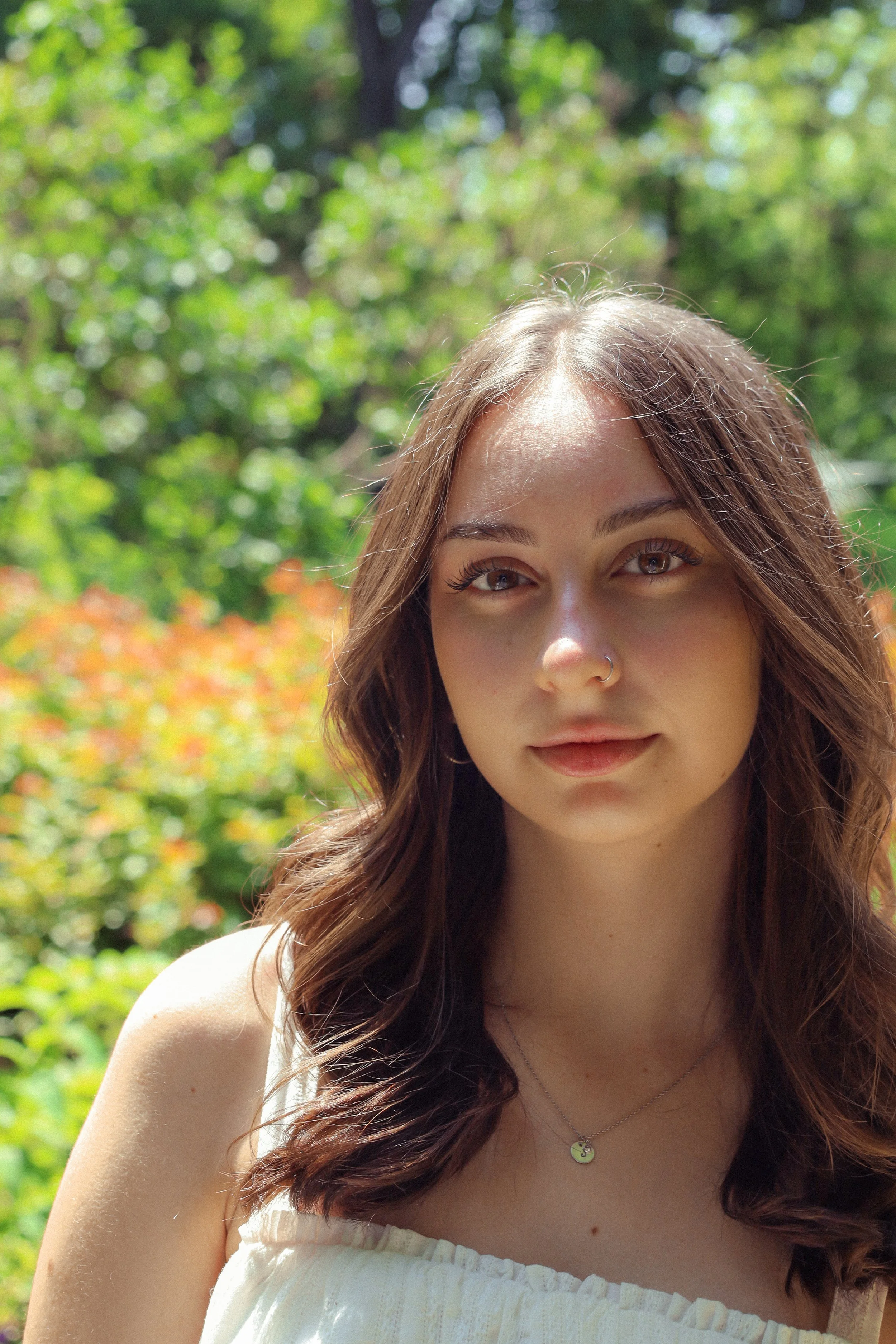 A young woman with long dark hair standing outdoors in sunlight, wearing layered necklaces and a light-colored top, with trees and foliage in the background. View fullsize