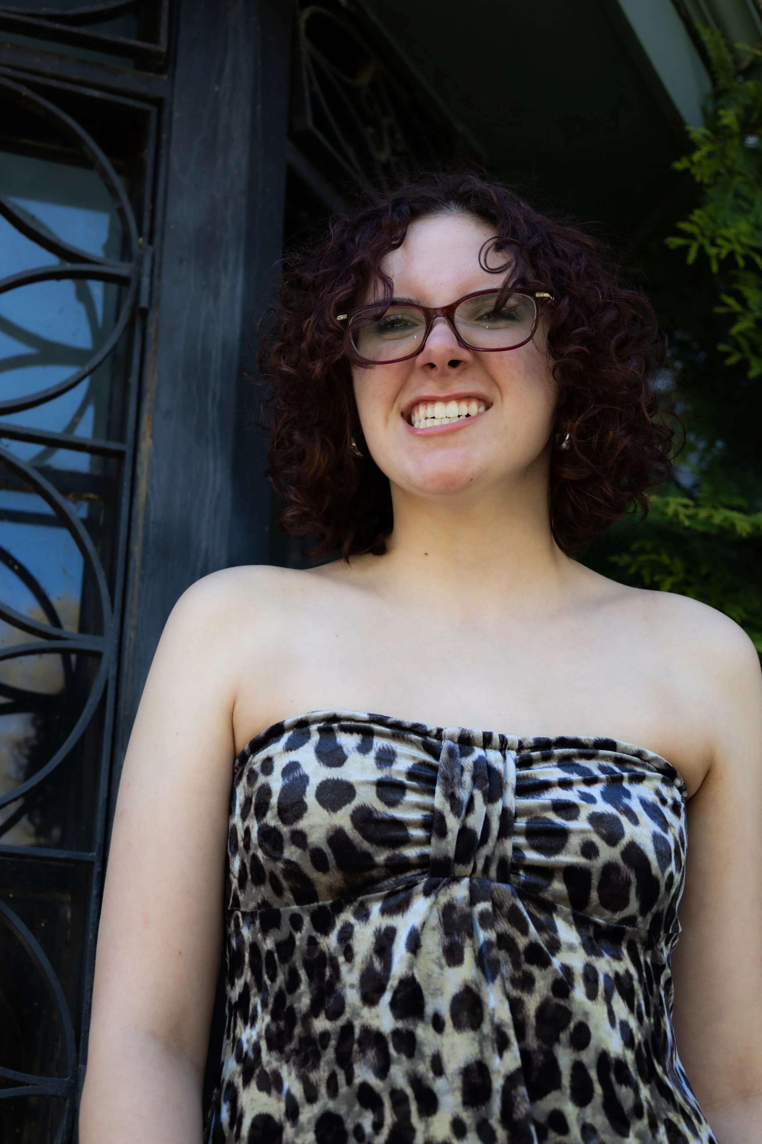 A woman with curly hair and glasses winks and makes a playful expression while standing outdoors in front of a black fence and green foliage, wearing a leopard print strapless top. View fullsize