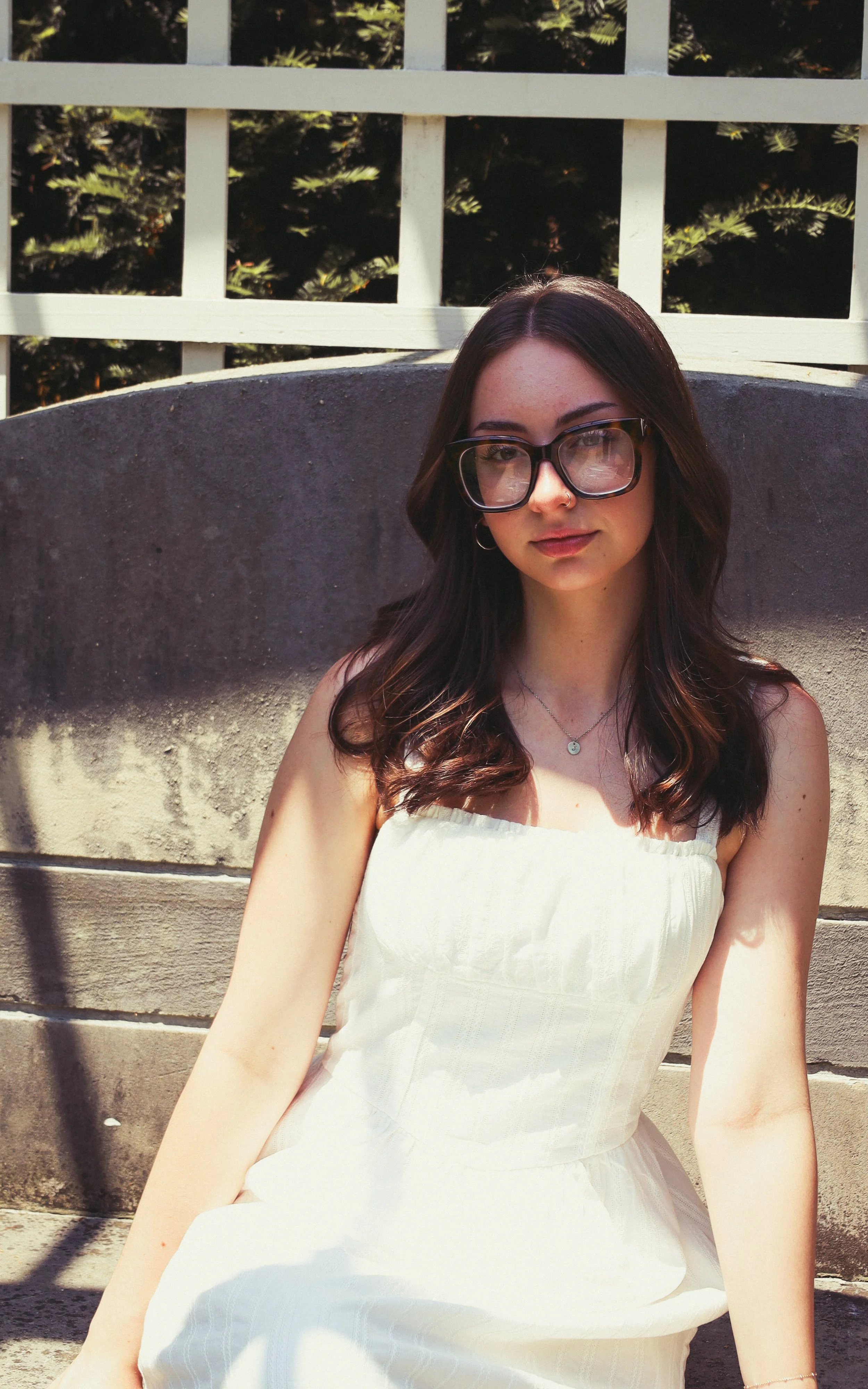 Young woman with dark hair, glasses, and light skin sitting outdoors in sunlight, wearing a white strapless dress.