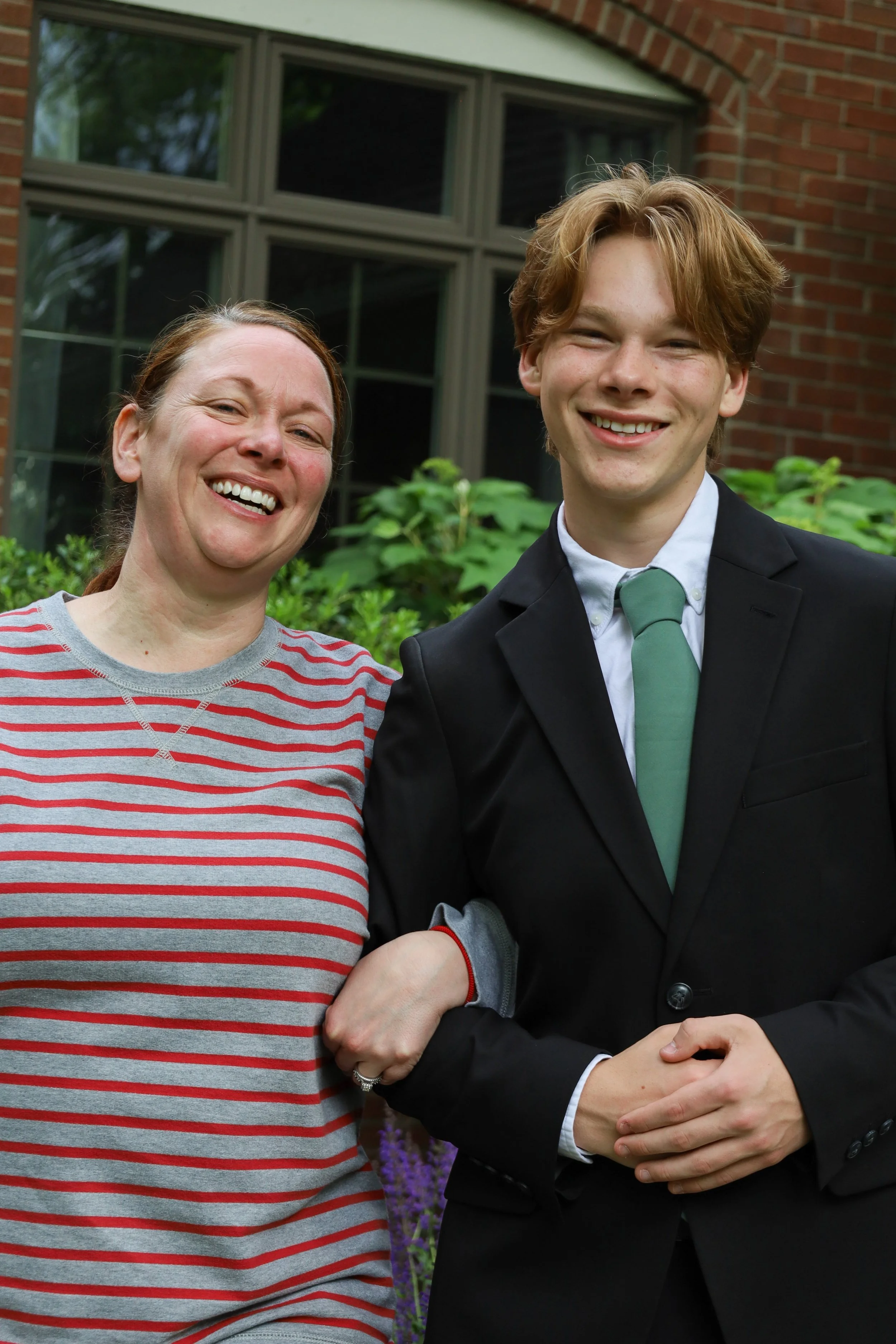 A woman and a young man smiling and standing outside in front of a brick house and green bushes. View fullsize